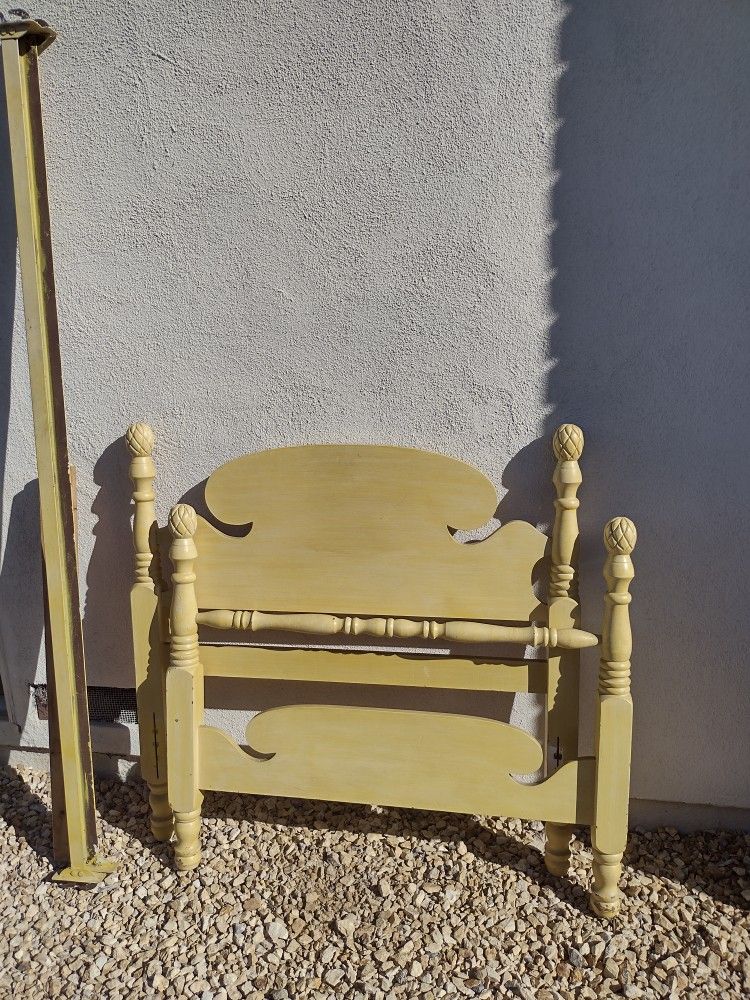 Free Yellow frame is twin size Free, free, paint your color of choice. Solid wood header and footer, metal side rails that lock in, no hardware needed.