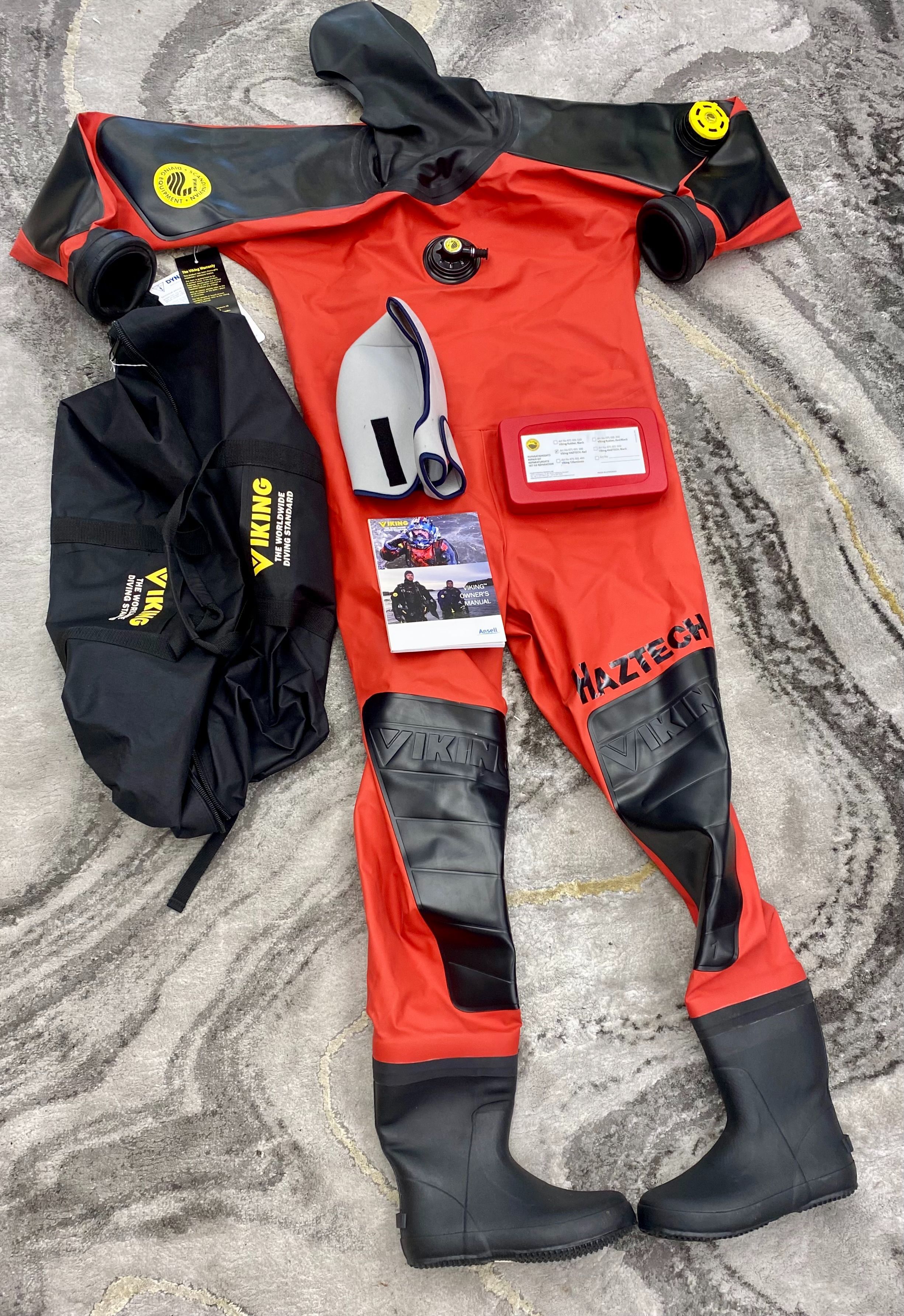 Viking HAZTECH Red Drysuit Reg Med 38 Boots US 6 Bag Hood Manual Repair Kit