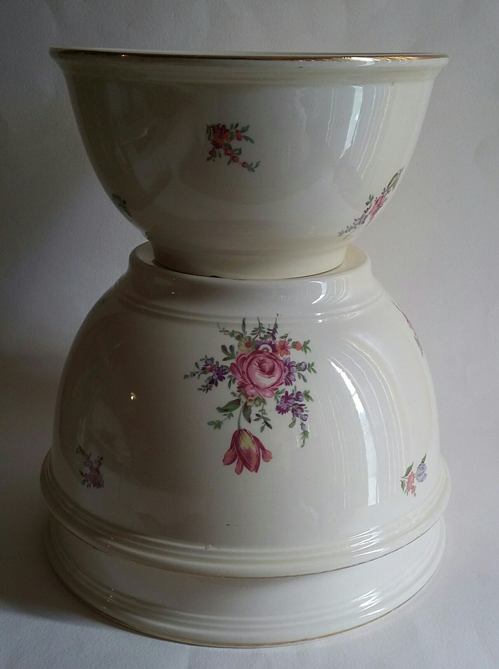Here is a lot of 3 vintage mixing serving bowls from Household Institute - Kitchen Kraft OvenWare. They feature the Priscilla rose pattern The lot consists of 2 large bowls, that measure approximately 5 1/2" tall x 10 1/4" across the top rim...and 1 medium bowl that measures approximately 4 1/4" tall x 8 1/2" across the top rim. Condition is good on the 3, One large bowl has a small chip on the rim. The medium bowl has a factory glazed over chip on the bottom. Some light utensil wear on the 3 bowls. Cash Only, Local Pickup. Thanks