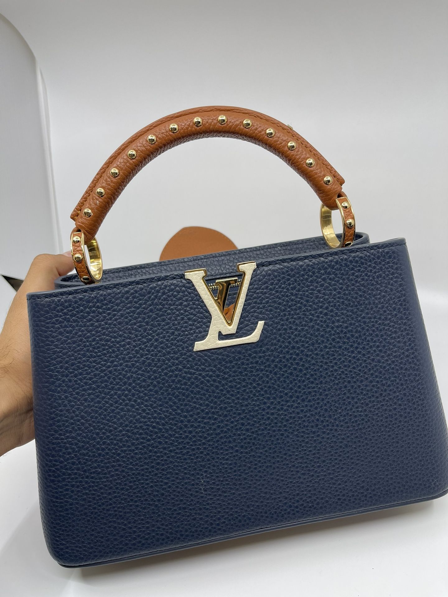 The adorable Capucines BB bag is made from Taurillon leather in an elegant dark blue that is enhanced by a warm caramel tone on the flap, handle and strap comes with dust bag