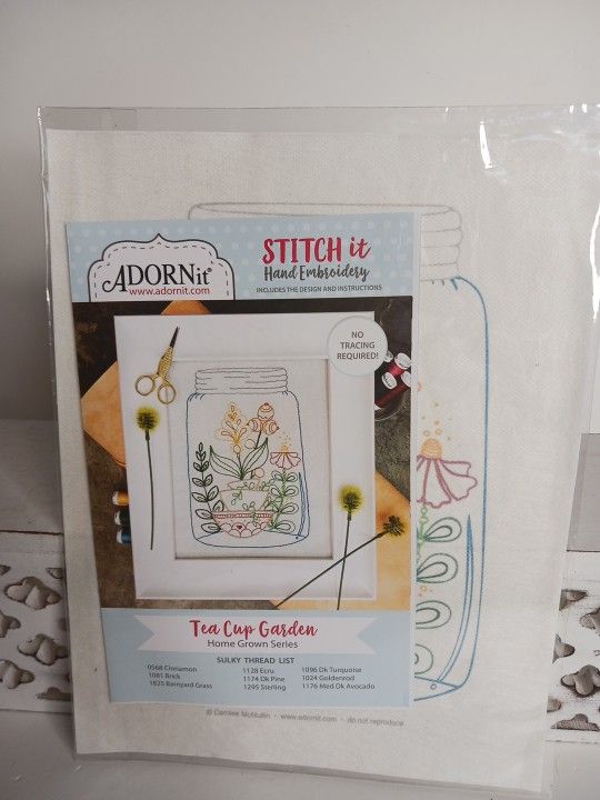 Office 426 It features a pre-printed design on wash-away stabilizer, meaning no tracing is required. The package includes instructions and a specific list of Sulky thread colors needed for the project. Once finished, the stabilizer dissolves in water.ADORNit "Tea Cup Garden" embroidery pattern from the Home Grown Series NEW count