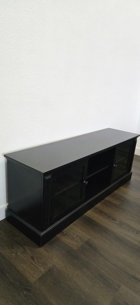 TV Stand Entertainment Center, black with glass doors. Measures 60" wide x 16" depth x 22.5" height. Willing to deliver within 10 miles.