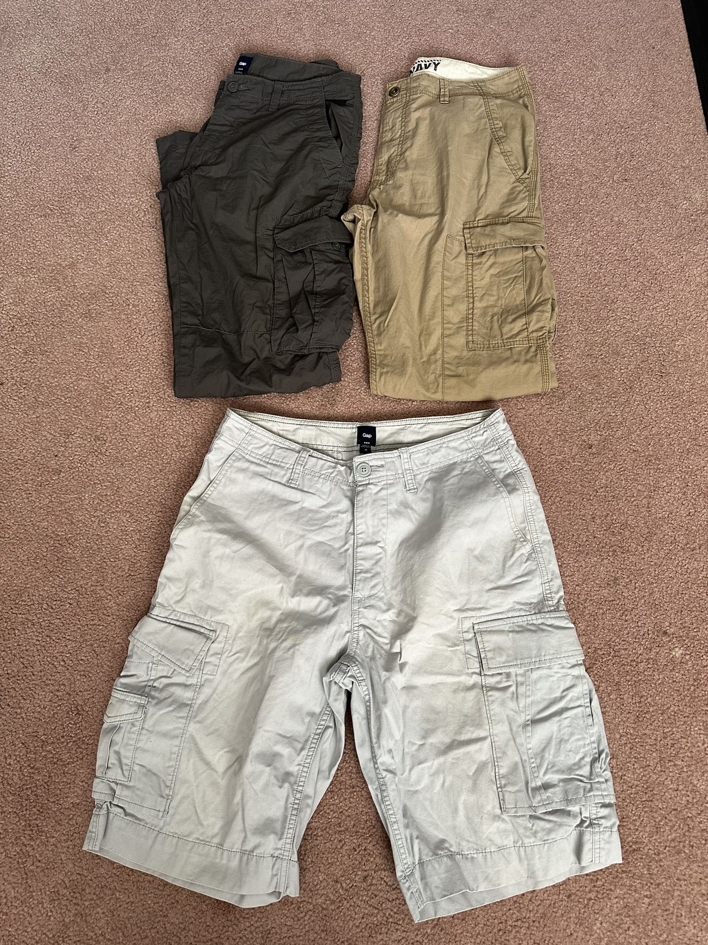 Cargo pants and shorts, Gap shorts and pants and Old Navy pants. All are size 32, 32x34. All 3 for $10.