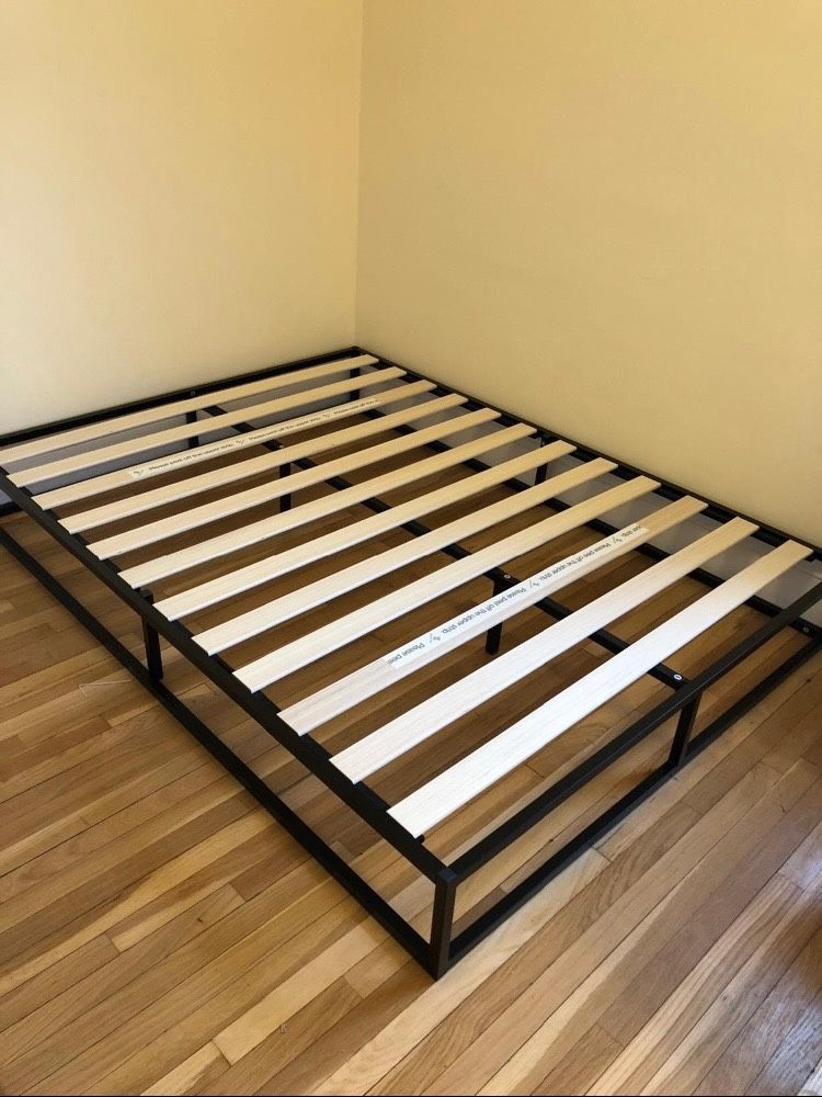 Selling a metal full sized bed frame with slats. You do not need a box spring. You simply put your mattress on top of the slatted bed base. It is very minimalist and doesn’t take up anymore room than the size of your mattress so it’s perfect if you’re tight on space. It is going to be disassembled into a few manageable parts for transport so it should fit in most cars. If you don’t have the means (or desire), I’m willing to deliver it (within reason) to you for an extra $20. Let me know what city you’re in for consideration. Thanks