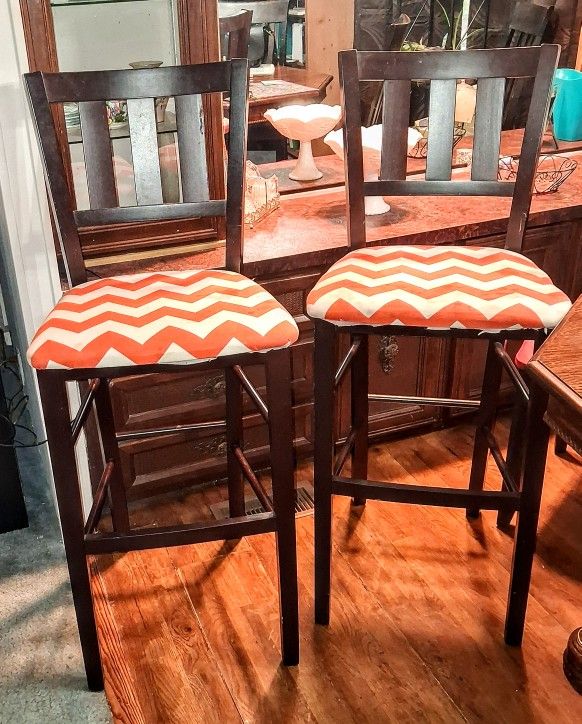 Set of two vertical ladder back bar stools I was going to refinish them but I have a couple too many projects going. So what is in great shape the Marshalls themselves are in great shape I just didn't like the material on top. 44 and 1/8 in high 18 and 1/8 in wide 19 and 3/4 in deep