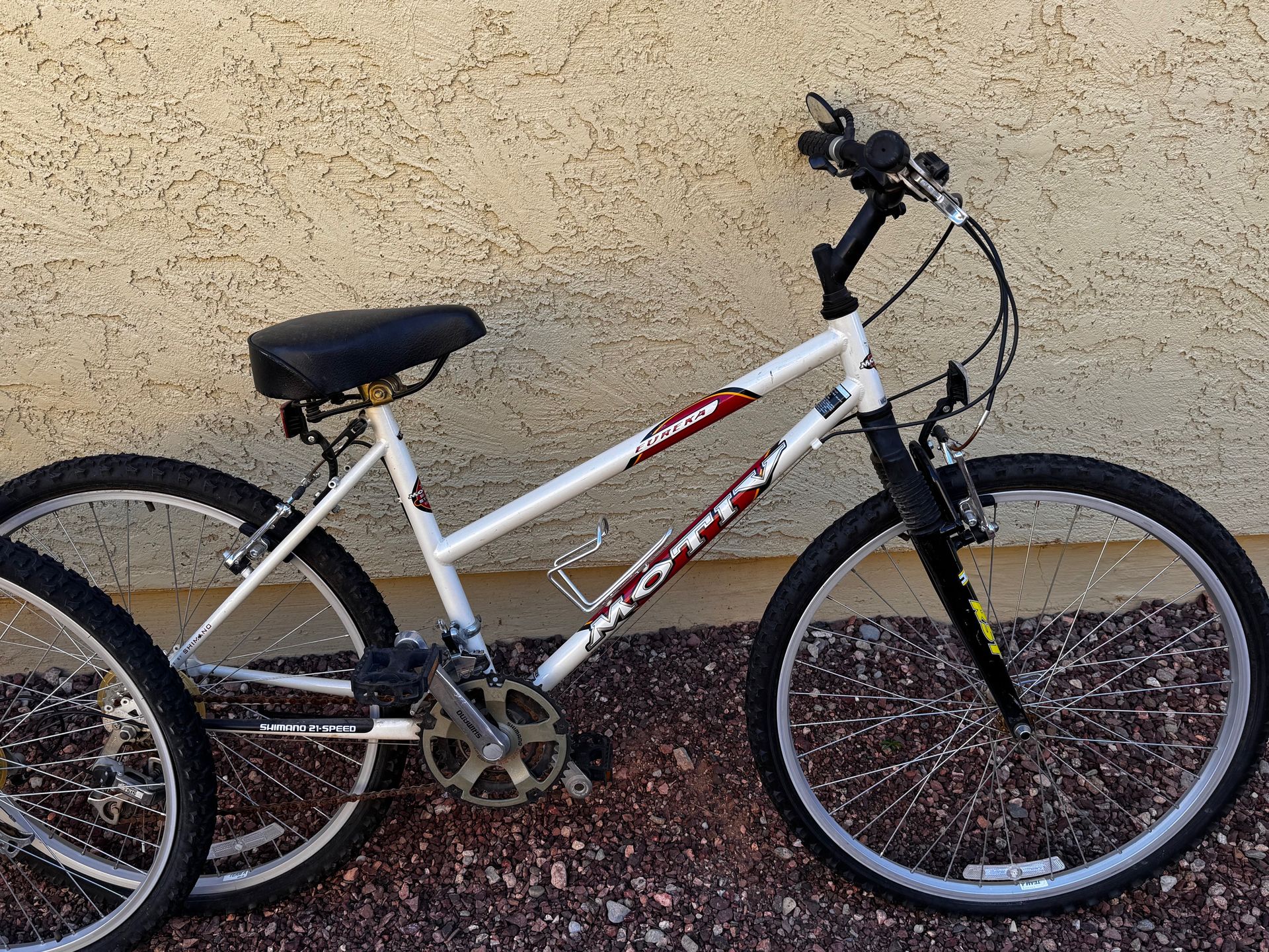 Very low use. 1 x 17” women’s frame white pearl paint Shimano SIS shifters. Good tires. 1 x 19.5” men’s frame red metallic paint Shimano SIS shifters. Good tires.
