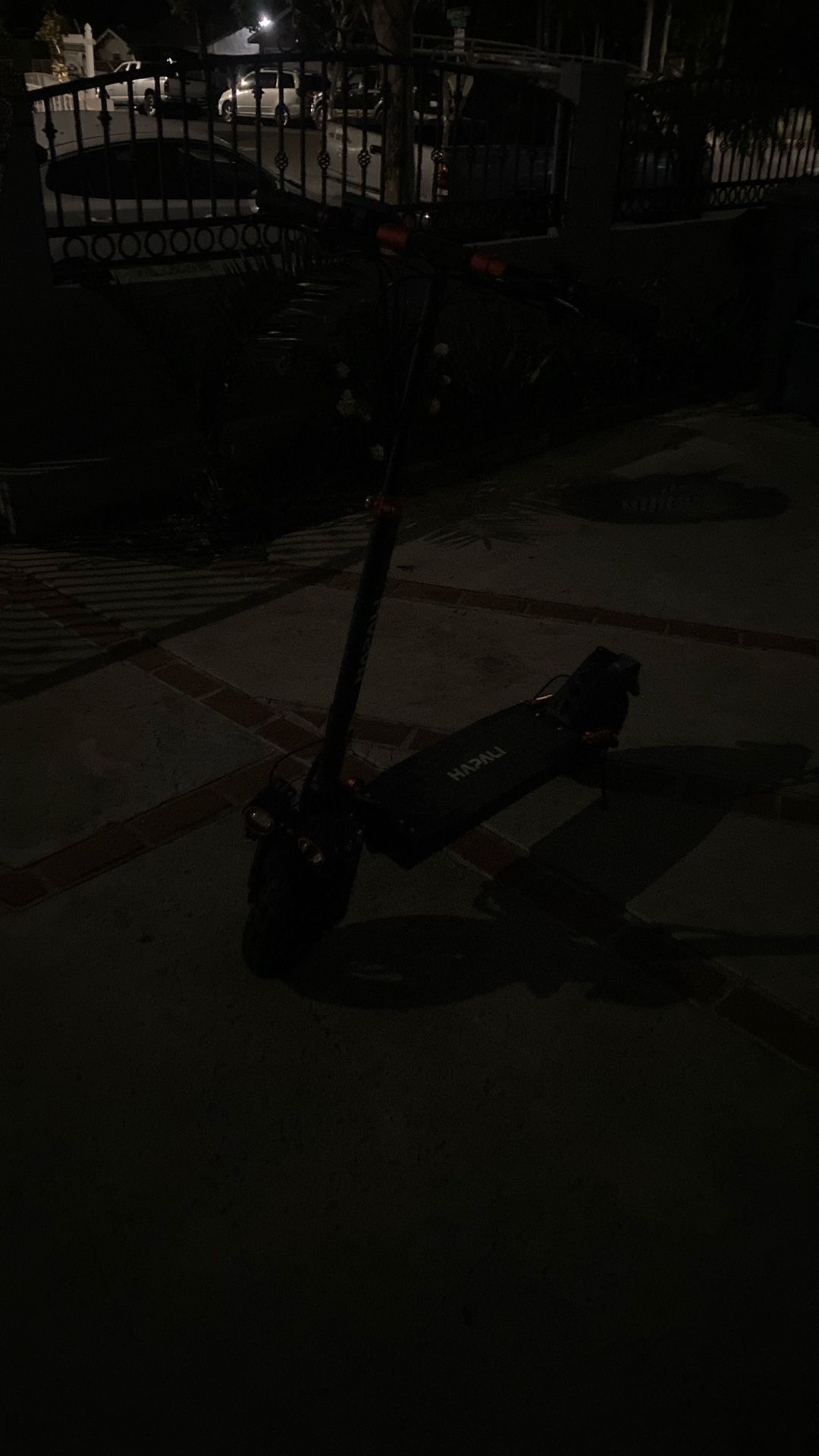 New scooter out the box. 3 speed modes Max speed:31 mph Front Double suspension Rear double suspension Deck light system 2 front lamps Front and rear brake USB connectivity for phone charging Horn Turn signals Foldable (65lbs) Handle bar height adjustment Inflatable tires Charger included