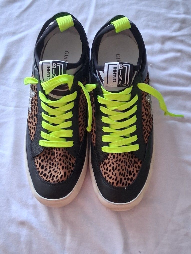 Stylish Gianni Bini women’s sneakers featuring a bold leopard print design with bright neon green laces. Perfect for adding a trendy and eye-catching touch to any outfit. ✨ Features: Brand: Gianni Bini Leopard print design Neon green laces (standout look) Comfortable and lightweight Durable rubber sole 📏 Size: Women’s 7.5