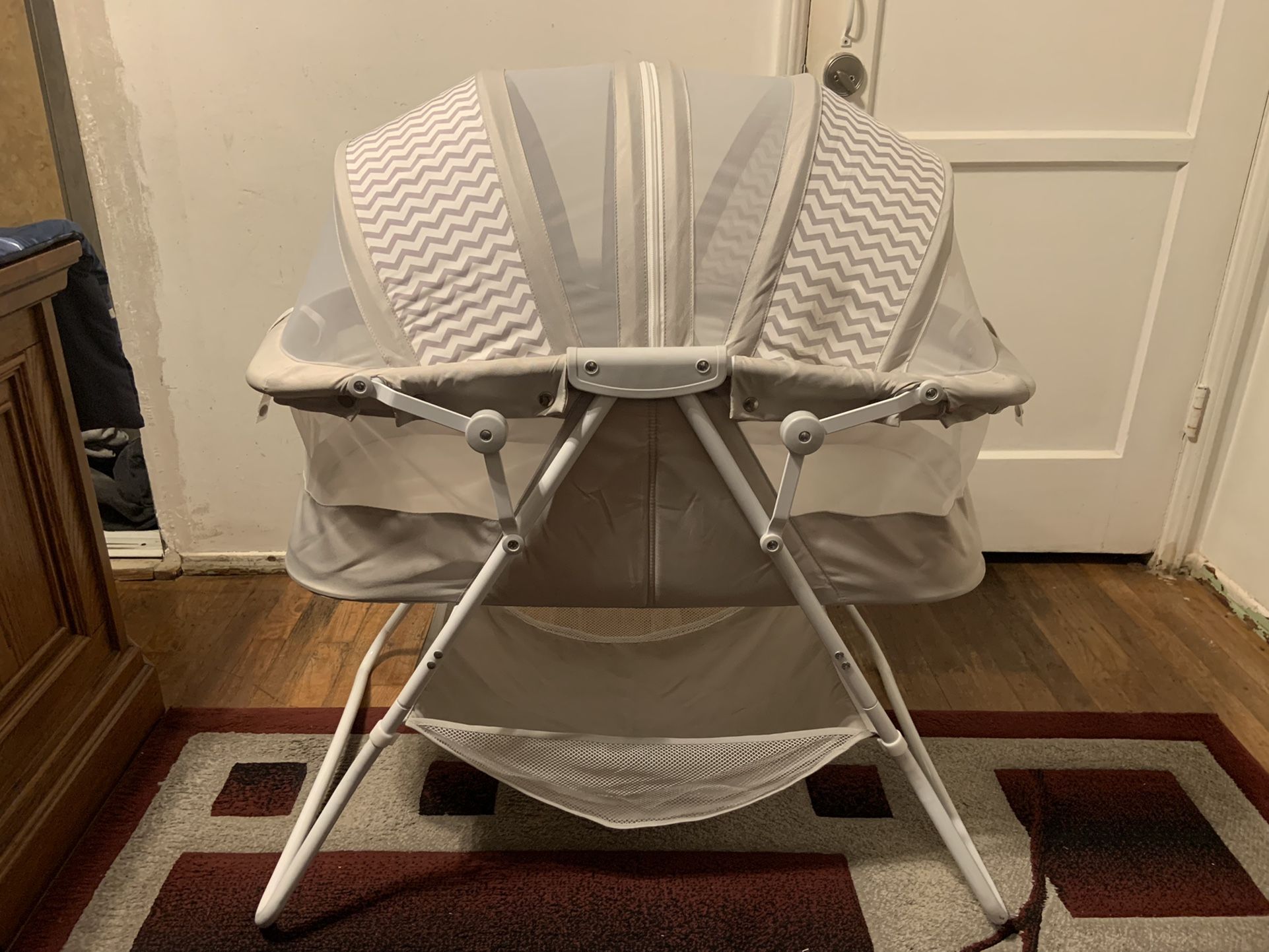 Great condition baby bassinet both canopies open and close, was recently cleaned, is portable and has space on the bottom for storage toys blankets etc. easy to use and to fold Has locks to keep durable and to fold, good clean mattress, am also throwing in a mattress cover. Price is firm , check out my other items