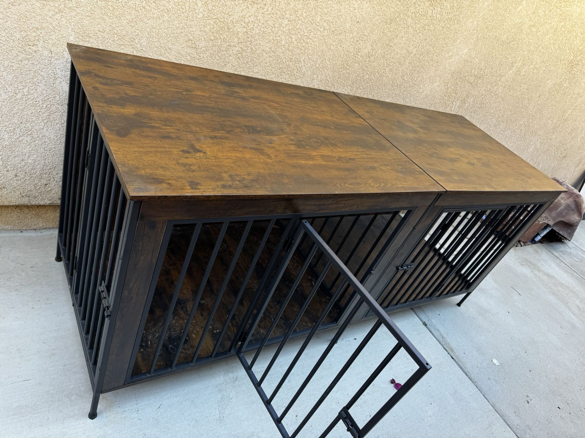 2 separate crates inside one Fits 2 large dogs comfortably Just needs to be wiped down, has been outside since we lost one of our babies.