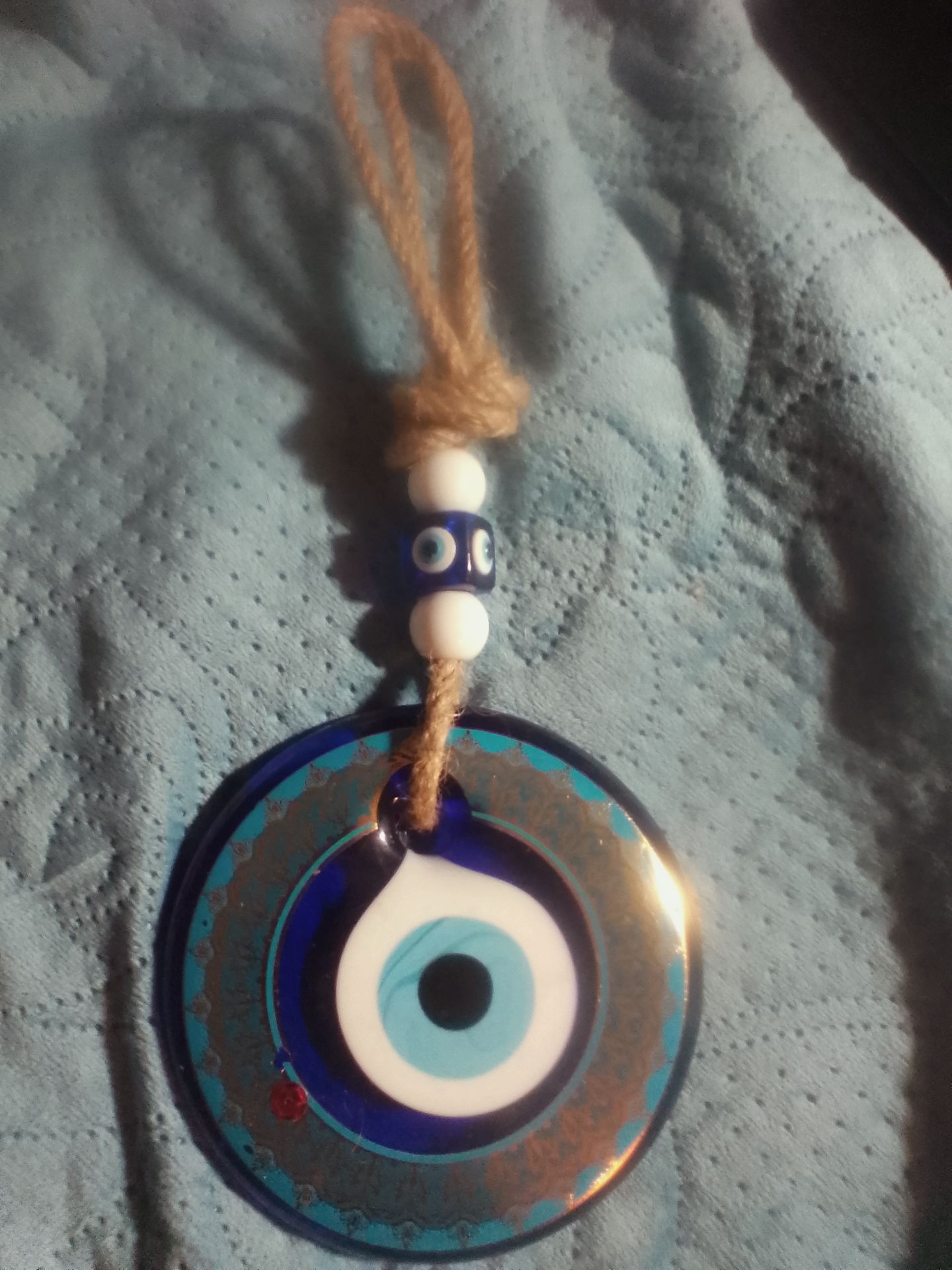 Handcrafted Turkish protector Blue Glass evil eye with beads the wall hanger 14 karat gold around the circle talisman 10 in Long 4 inches wide rare
