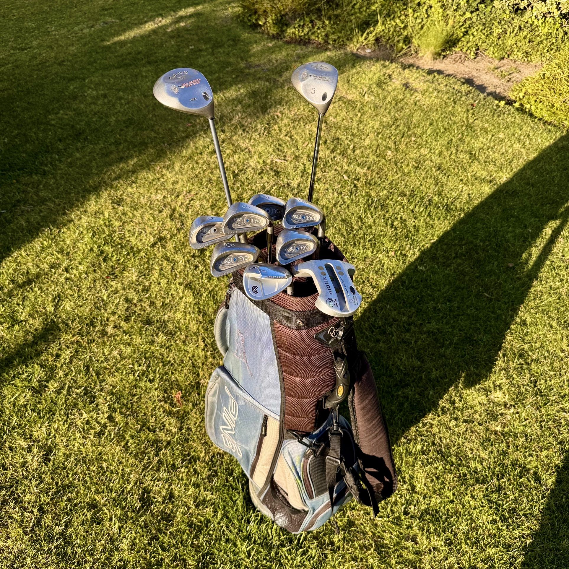 Excellent playing set of highly-forgiving Ping Eye 2 irons; 5, 6, 7, 8, 9, W. The Ping Eye 2's are largely regarded as one of the best all around iron sets ever made. Also comes with Cleveland Smart Sole sand wedge, classic Tour HiGHLY Titanium one (hits like a Cleveland HiBore), Wilson D7 3 drivers, a MG Golf 415 CR face balanced putter and a Ping cart bag. Also come with some balls and T's, so you're ready to hit the course. Everything is in great shape including the grips.