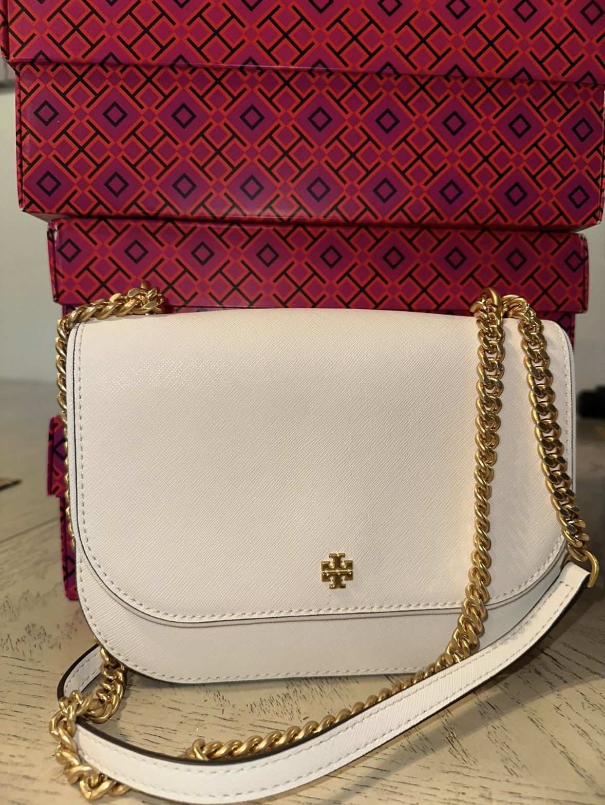 TORY BURCH EMERSON LEATHER FLAP ADJUSTABLE CHAIN SHOULDER BAG . 100% Authentic! RETAIL $498.00 STYLE :150611 / 0523 COLOR :OPTIC WHITE / 137 Never worn NO TAGS 🏷️ • Medium Shoulder •Golden hardware. • Leather and Chain strap; 12 "/ 22.5" drop . Shoulder Strap can Be doubled • Two Compartments With One Zipper closure. • Leather double-T logo Medallion at front • Inside, Slip Pockets.