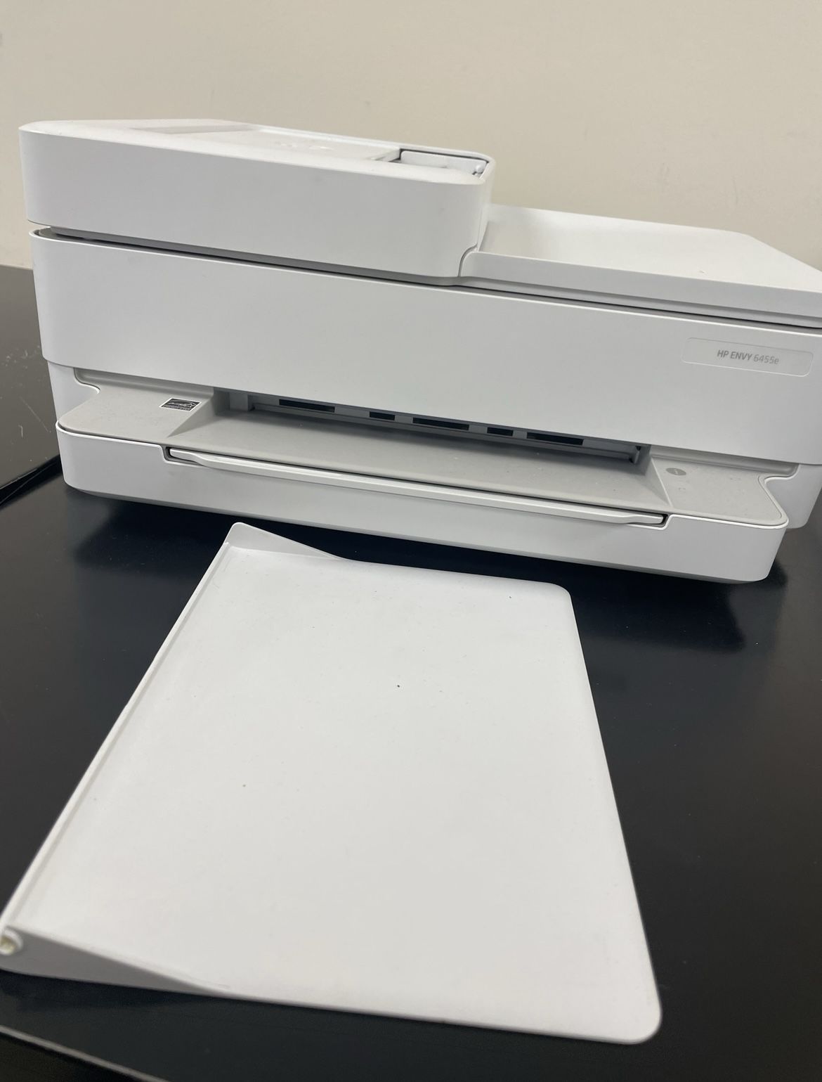 Hp envy 6455 wireless all in one printer. The paper tray has broken off but still works fine if attached. This will be reflected in the price.