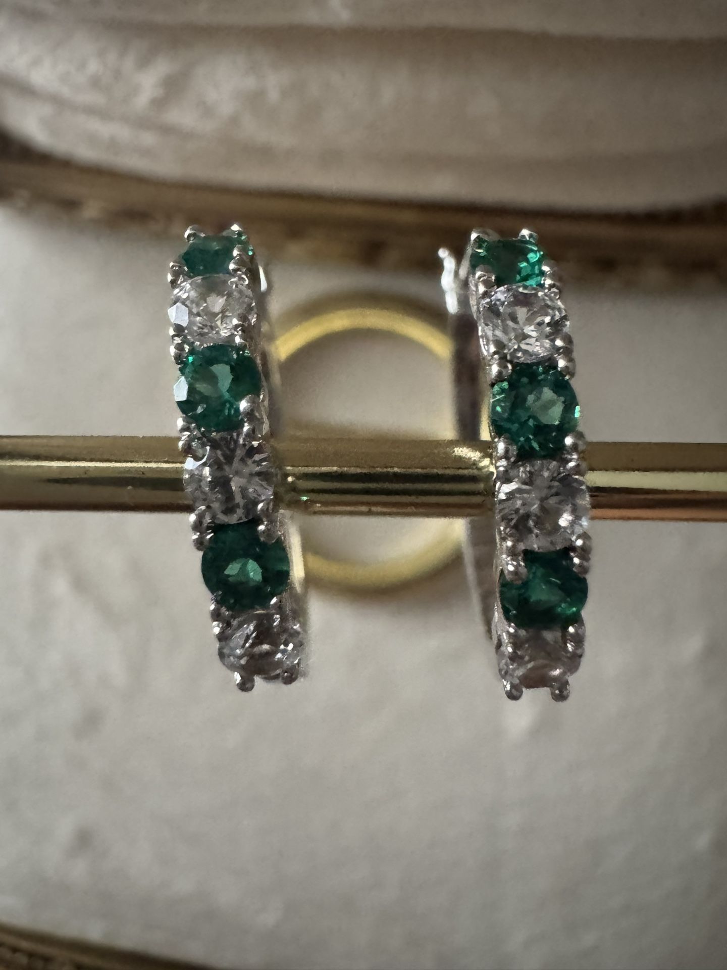 Sterling Silver ~3MM Emerald & White Sapphire Prong Set Hoop Earrings