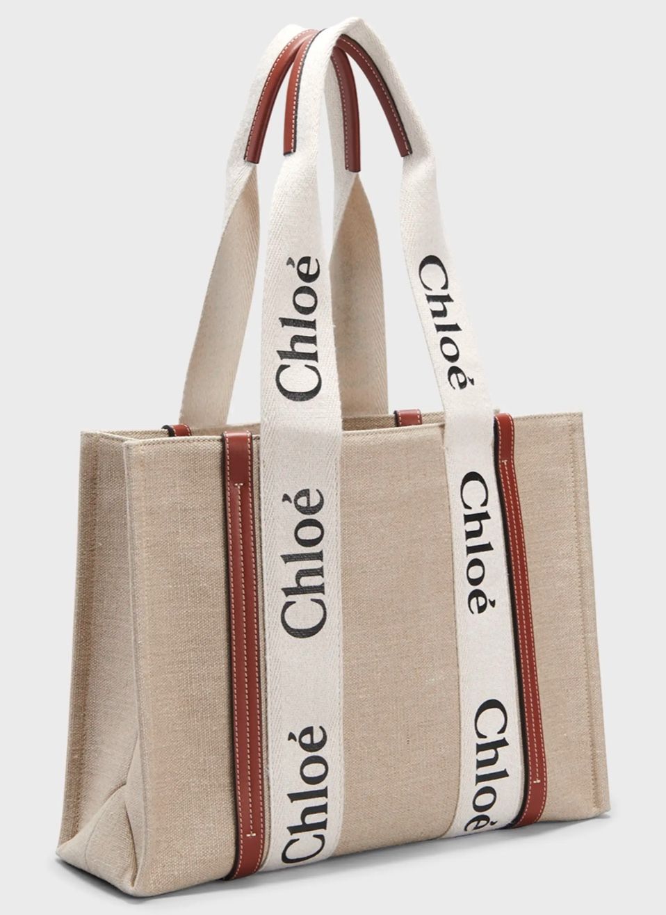 New Chloe tote bag in linen with calf leather trim and Woody logo ribbon Modern lines are emphasized by the contrasting vertical leather strips and the signature Chloé logo ribbon in lower-impact line Rolled tote handles, 8.7" (22 cm) drop Can be worn on the shoulder Interior, one spacious main compartment, one flat pocket Comes with a dust bag Lining: Cotton Item weight: 1.7 lbs. Professional cleaning recommended Made in Italy