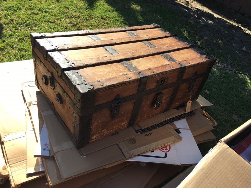 L.E. Morrison & Company from Indianapolis Indiana Bee Hive Trunk Factory traveling trunk. This measures 36" x 22" 13". This old trunk has a lot of character and is pretty good condition for it's age.