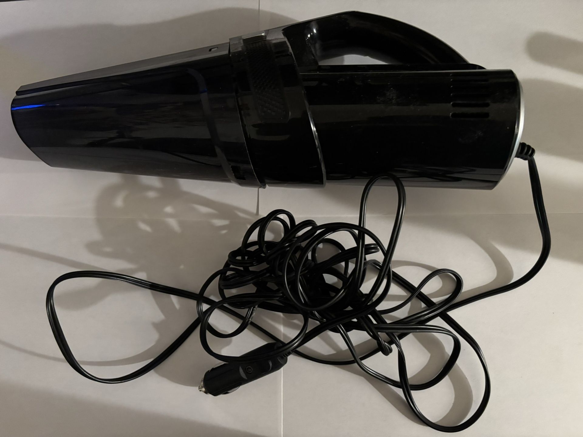 — plugs into car's 12V port/charger port/cigarette lighter — storage bag and extra filter included
