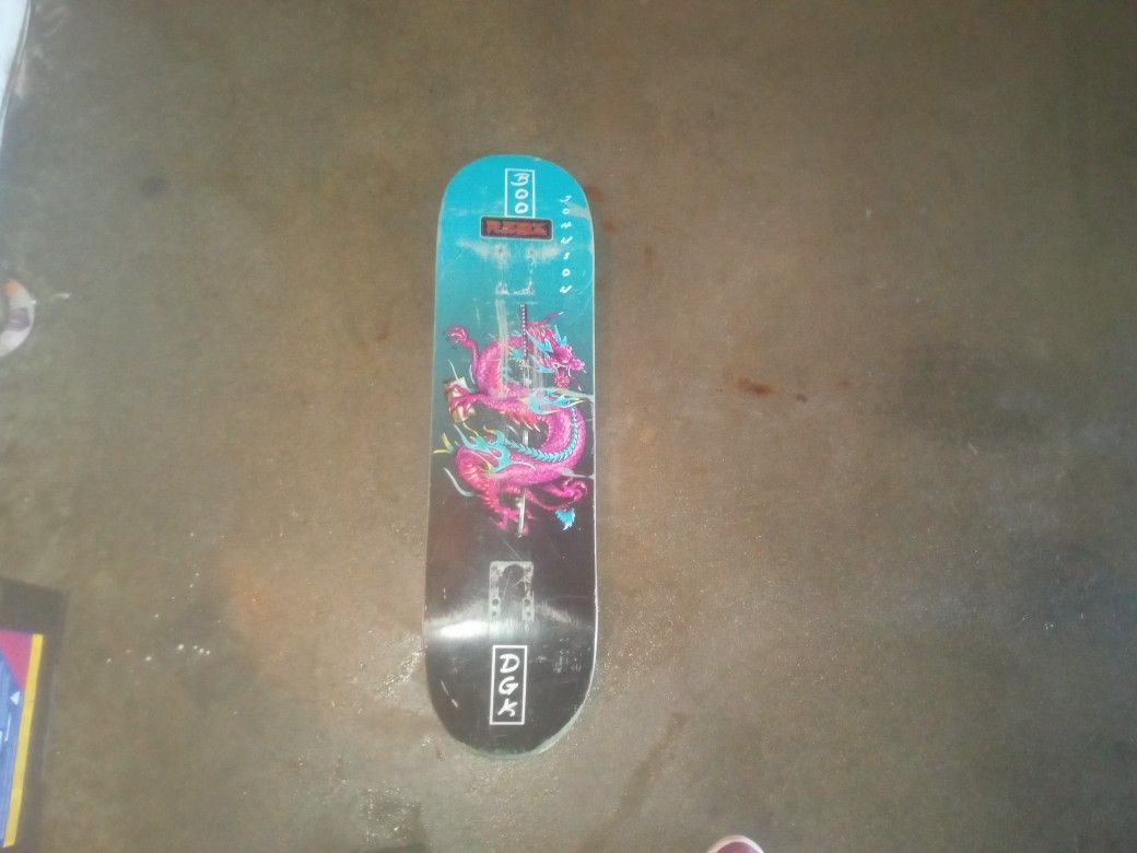 Skateboard with dragon on bottom and rose on grip