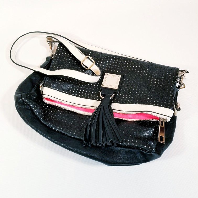Black triangle mesh exterior with ivory layer underneath, ivory strap and silver finishes. Bright pink interior is slightly stained from normal use, still good condition. Main zipper works, but dose stick. Measurements are approximate laying flat: Width: 12" Height: 15" open, 9" folded over Bottom: 3" x 12"