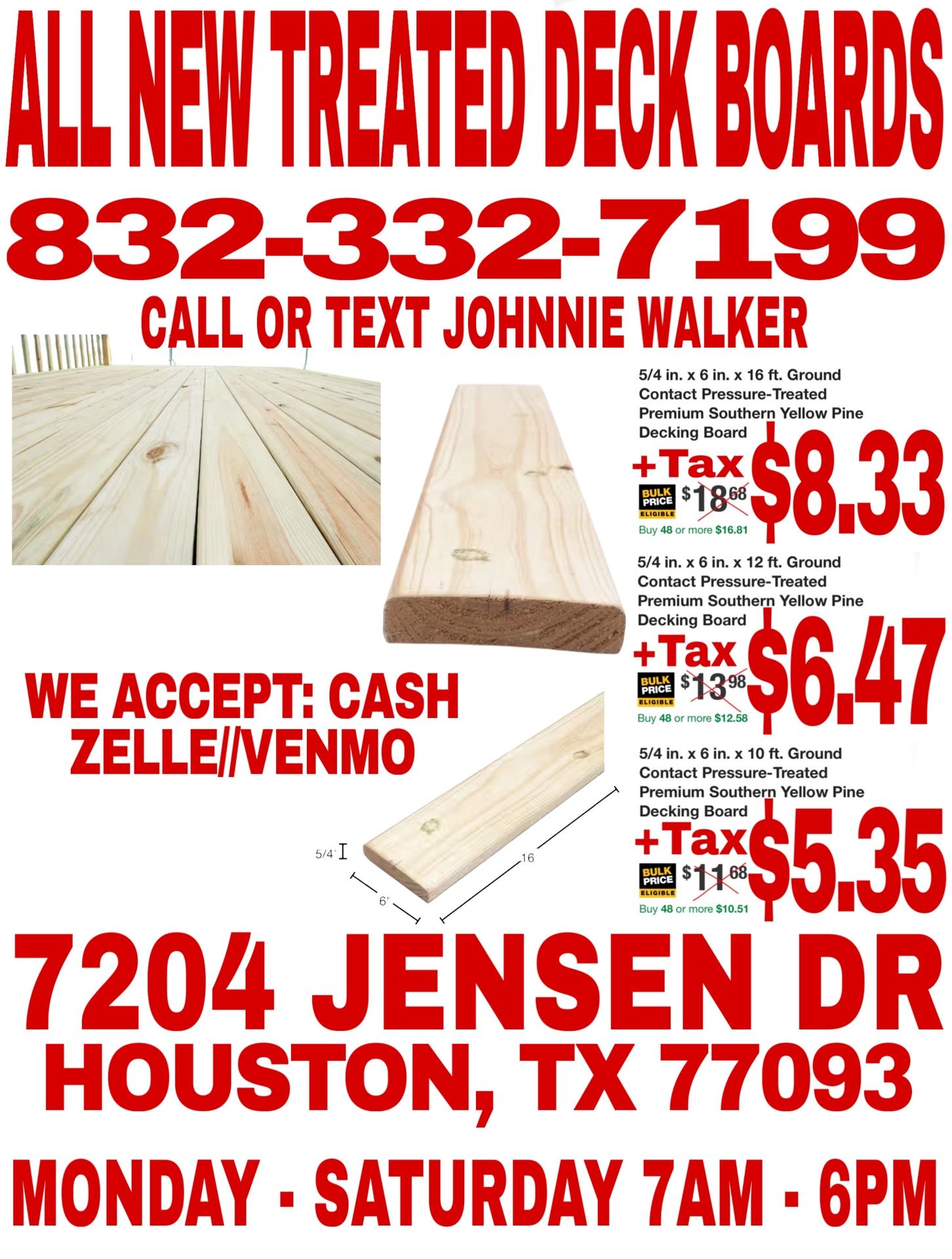 All New Treated Deck Boards True 1”X6” $5.35+Tax 10FT ~ $6.47+Tax 12FT ~ $8.33+Tax 16FT TREATED 2X6s 2x6x8 $4.75+Tax ~ 2x6x10 $5.95+Tax 2x6x12 $7.35+Tax ~ 2x6x14 $8.55+Tax 2x6x16 $9.86+Tax ~ 2x6x20 $11.20+Tax TREATED POSTS ~ ALL PRICES PLUS TAX 4x4x8 $8.25+Tax ~ 4x4x10 $10.50 ~ 4x4x12 $11.50 4x6x10 $18.00 ~ 4x6x12 $22.00 ~ 4x6x16 $27.00 6x6x10 $29.00 ~ 6x6x12 $32.00 ~ 6x6x16 $45.50