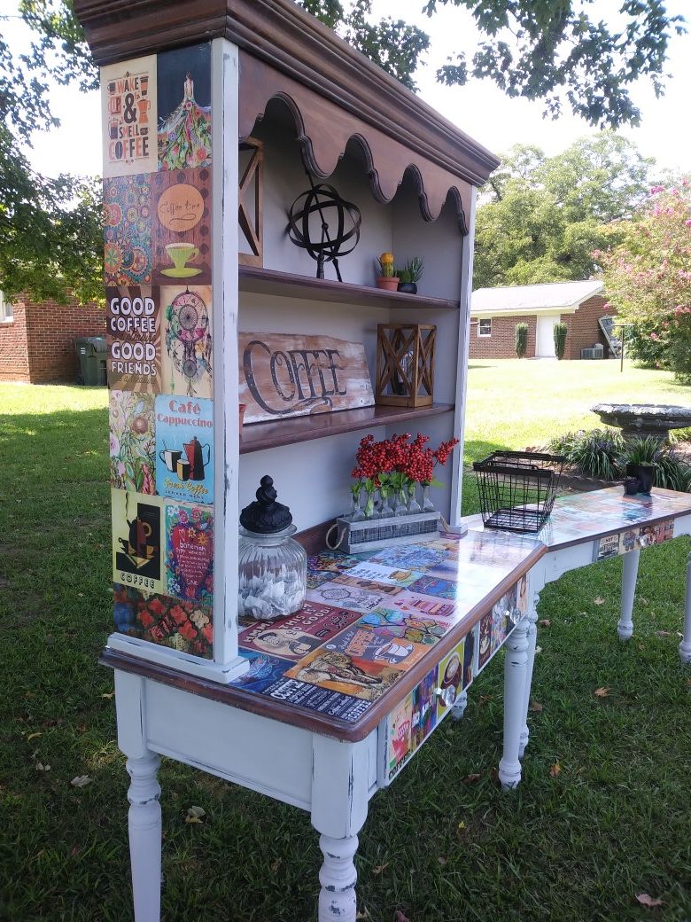 Bohemian and coffee themed hutch and server/entryway table