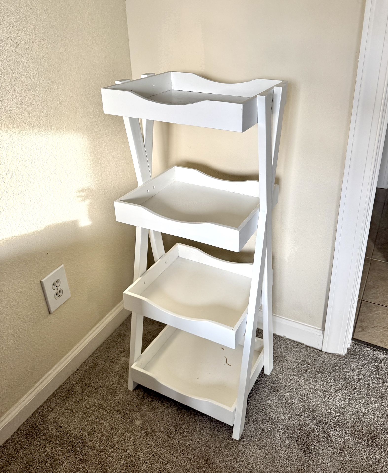 White 4-tier wooden shelf perfect for display or storage. Works great in a bathroom, kitchen, bedroom, college dorm room, or entryway for organizing decor, plants, books, toiletries, or small items. Solid and lightweight with a compact design that fits easily into corners or small spaces. Dimensions: • Height: 39 inches • Width: 14 inches • Depth: 12 inches