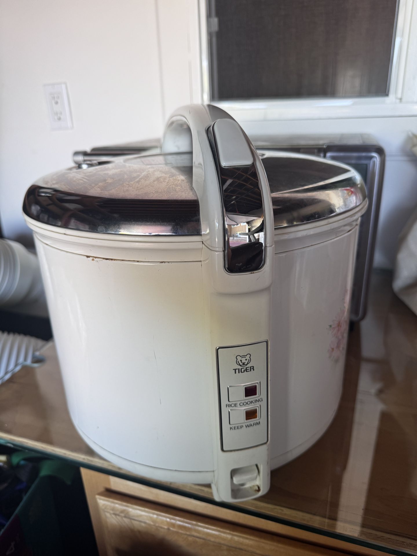 Tiger brand large capacity rice cooker, perfect for family use or parties. • Size: 10 cups (uncooked rice). • Functions: Rice Cooking and Keep Warm. • Durable Japanese brand, well-known for quality. • Used condition, works properly (shows some wear on the outside, see photos). • Great for cooking rice, porridge, or keeping food warm.