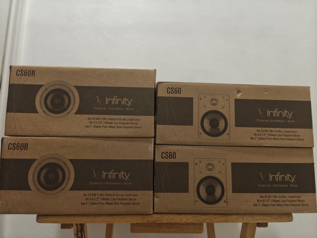 Sealed boxes! Infinity CS60 Highlights Flush-Mount Design High-Efficient 100W Driver Pivoting Tweeter Versatile Placement Paintable Features Sit back and enjoy exceptional sound reproduction at an affordable price with the Infinity CS Series CS60 2-Way In-Wall Speaker. This stylish series was designed for both professional and entertainment enthusiasts with the capability to deliver a full, clear, and tight sound response for applications where space is limited. Built with a powerful 6-1/2" woofer, 1" pivoting tweeter, and 100W of peak power - this speaker is an ideal solution for home theater, whole house audio systems, and anywhere quality, in-wall sound projection is required. Infinity CS60R Highlights Flush-Mount Design High-Efficient 100W Driver Pivoting Tweeter Versatile Placement Paintable Features Sit back and enjoy exceptional sound reproduction at an affordable price with the Infinity CS Series CS60R 2-Way Round In-Ceiling Speaker. This stylish series was designed for both professional and entertainment enthusiasts with the capability to deliver a full, clear, and tight sound response for applications where space is limited. Built with a powerful 6-1/2" woofer, 1" pivoting tweeter, and 100W of peak power - this speaker is an ideal solution for home theater, whole house audio systems, and anywhere quality, in-ceiling sound projection is required.
