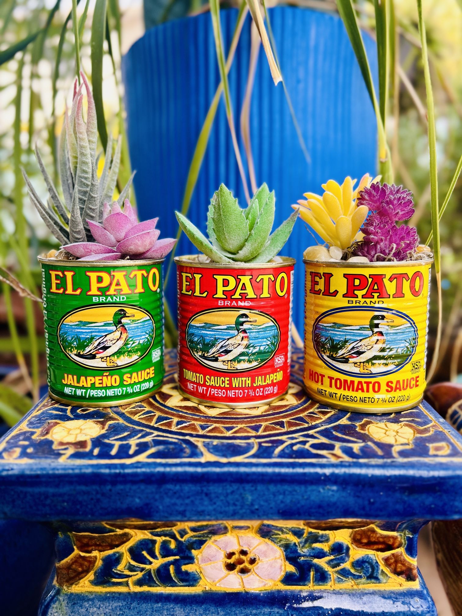 Selling handmade faux succulents in Mexican El Pato sauce cans. $7 each. They make for super cute and unique decor! A fun little gift for Christmas. Arrangements include 1-2 succulents, Spanish moss, and polished rocks.* Comes in red, yellow, and green cans. Please specify which you would like or any other custom requests π *Some cans may have slight imperfections. Succulents and arrangements may vary from pictures.