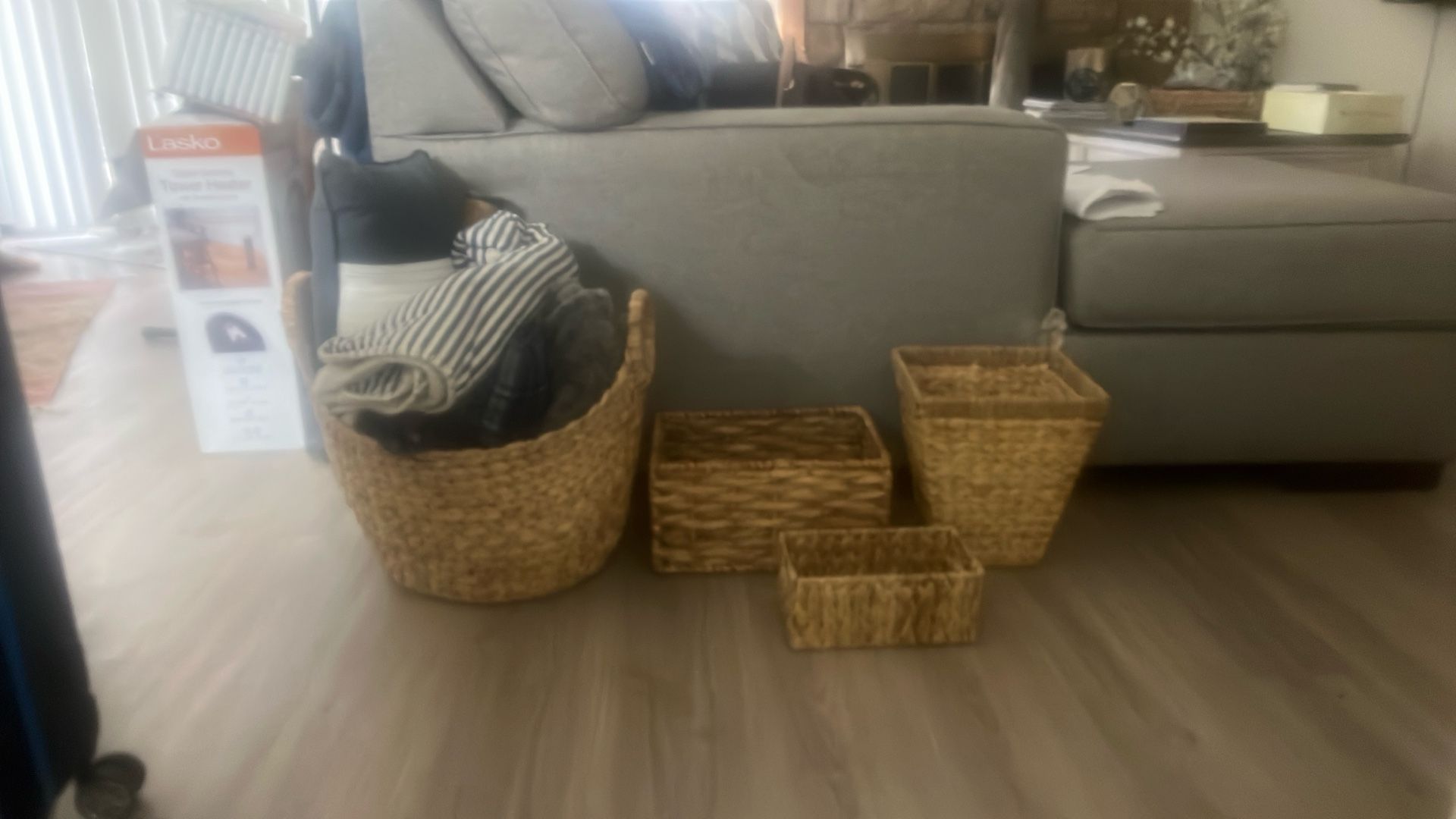 Rattan baskets of various sizes. Sold seperately or together. Largest basket with handles- $20 Second largest square top basket- 10”L x 10”W x 11.5”H - $12 Rectangular basket- 13.5”L x 6.5”H x 9.5”W- $12 Smallest rectangular basket- 9.5”L x 4”H x 5.5”W- $5 Or $45 for all