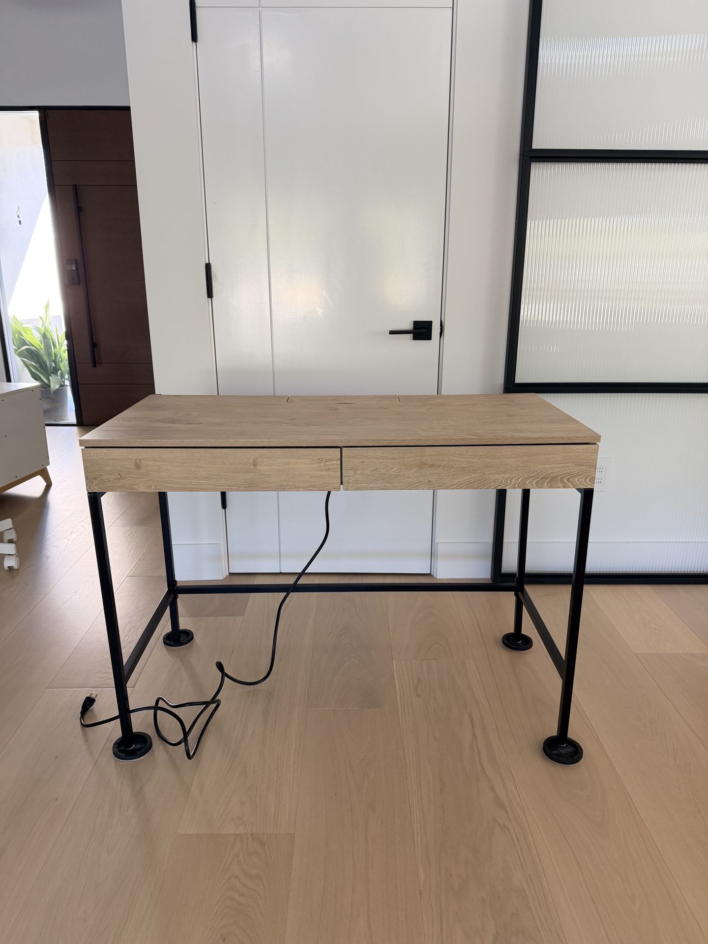 Dimension: 42” W x 20” D x 30” H Condition: Like New This contemporary writing desk blends minimalist design with high-tech utility. Perfect for students, remote workers, or as a stylish console table. The Details: • Smart Cable Management: The recessed power hub allows you to plug in your desktop or lamp internally, while the discrete cord exit keeps your workspace looking clean. • Durable Build: The powder-coated black steel frame provides an industrial edge, while the light wood-look top adds warmth to any room. • Dual Drawers: Minimalist "handle-less" design maintains a clean silhouette while providing plenty of storage. • Versatile Style: Fits perfectly with Modern, Industrial, or Scandinavian decor. "The integrated power hub is a lifesaver—it has 2 standard AC outlets and 2 USB ports. I used it to hide all my laptop and lamp cords so the desk stayed completely clutter-free." Matching Night Stand available for sale together. Please see the night stand listing