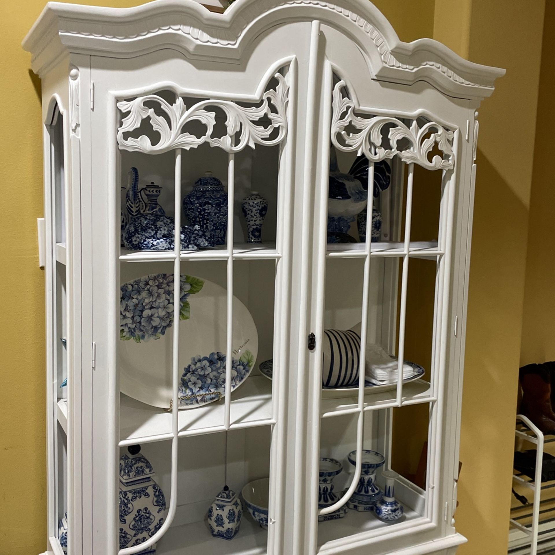 Sturdy in color white. It was used to display vintage fine China. No glass but can be put glass if you want. Items inside are not for sell. Only serious buyers and No delivery. Thank you
