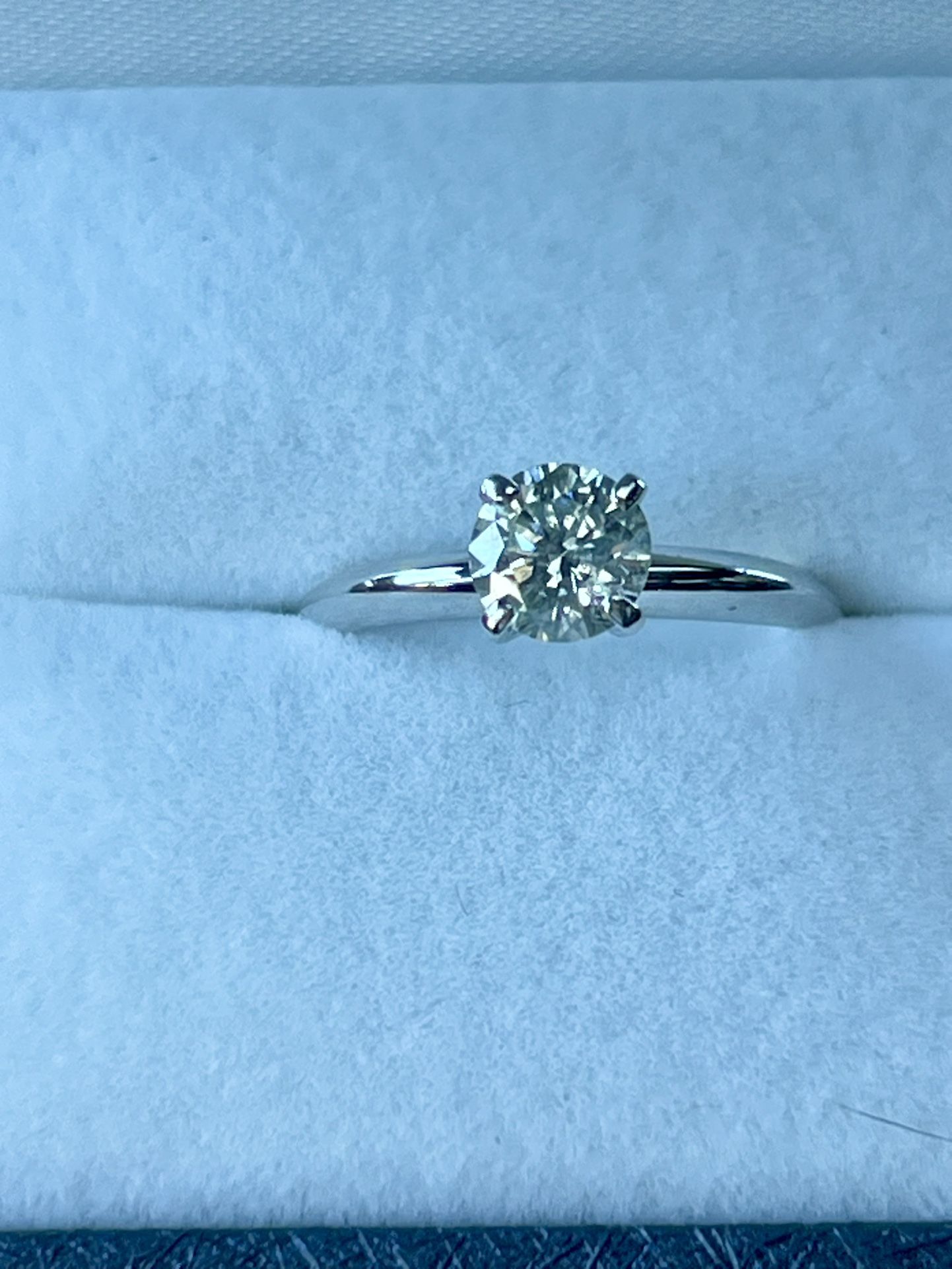 Gorgeous .74 round cut natural diamond solitaire with 14k white gold setting, size 6. Bought in 2022, only worn for a year. Recently received rhodium coating. Paid over 3000.00, receipt in photos as well as appraisal. Carat .74 Cut round Color H Clarity SI2