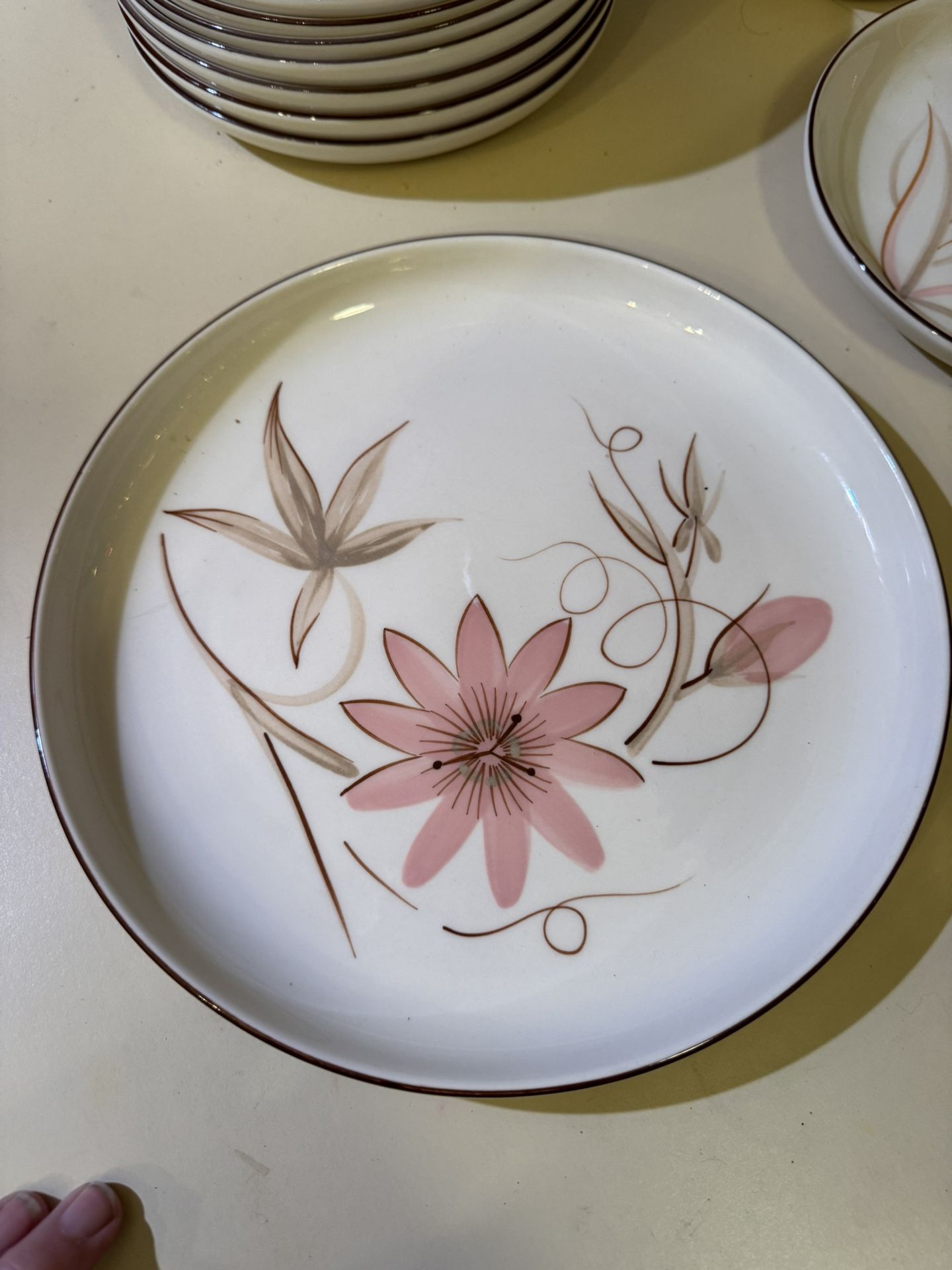 Pictures show exactly what you’re getting, eight dinner plates, seven salad plates, four larger bowls, and two small bowls. One of the dinner plates has a chip. Just noticed it. Porch pick up in MARYSVILLE.
