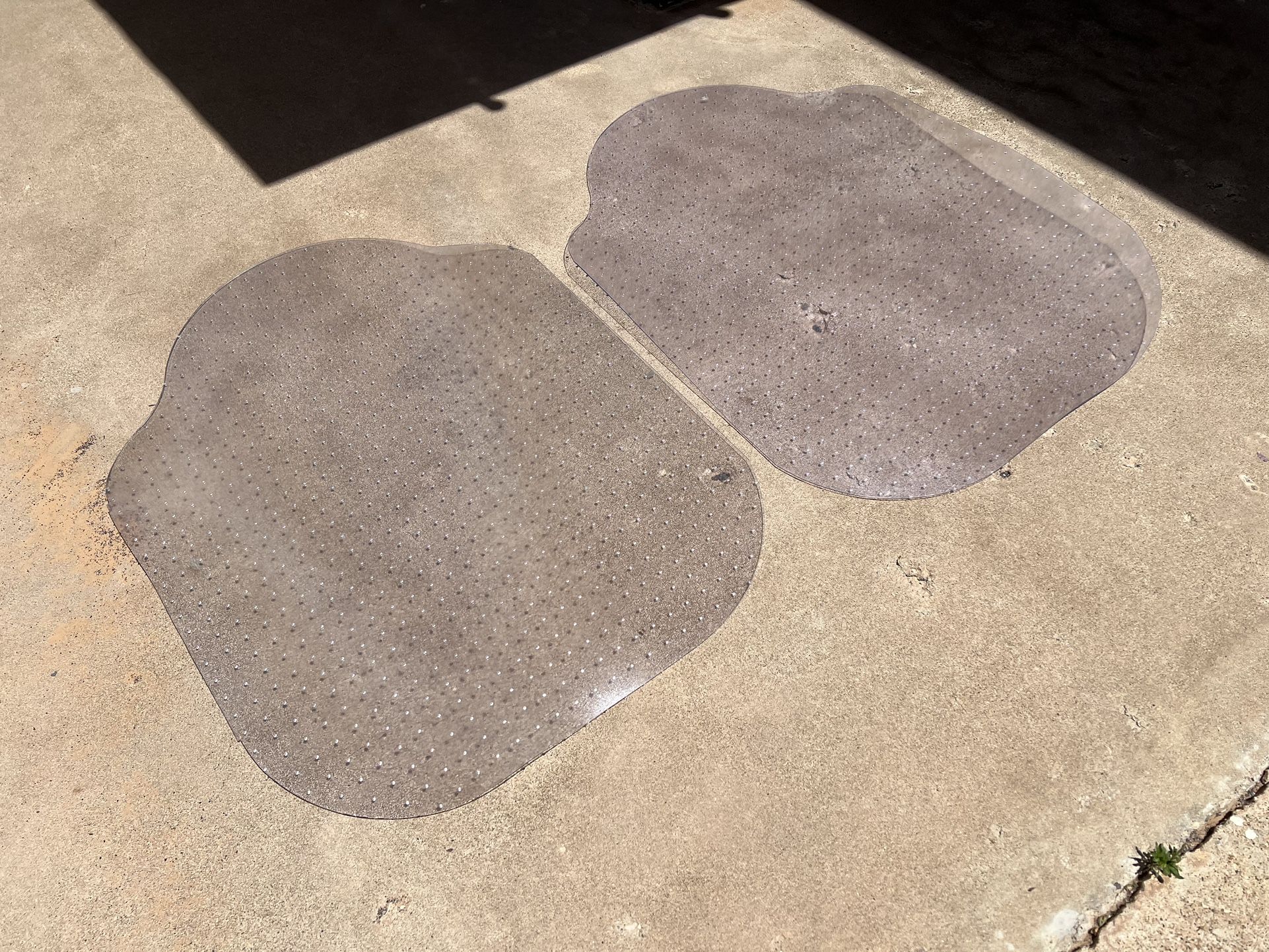 Recently moved, no longer need. 2 high quality thick chair mats made for carpet floors or rugs. Mats have carpet pegs to prevent slippage. Approximately 4x4foot. You’re welcome to buy one only if you prefer. No stains or tears, photographed on concrete but actually transparent. $12 each or best offer.