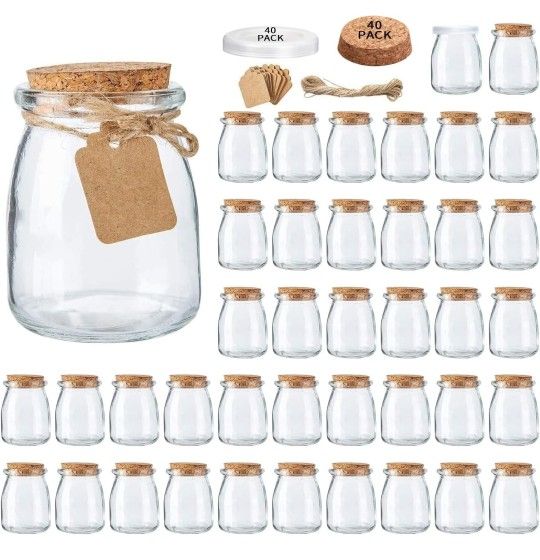 Glass Mini Yogurt Jars, 40 Pack, 7 oz Favor Jars With Cork Lids, Mason Wedding Favors, Honey Pot, Pudding Containers