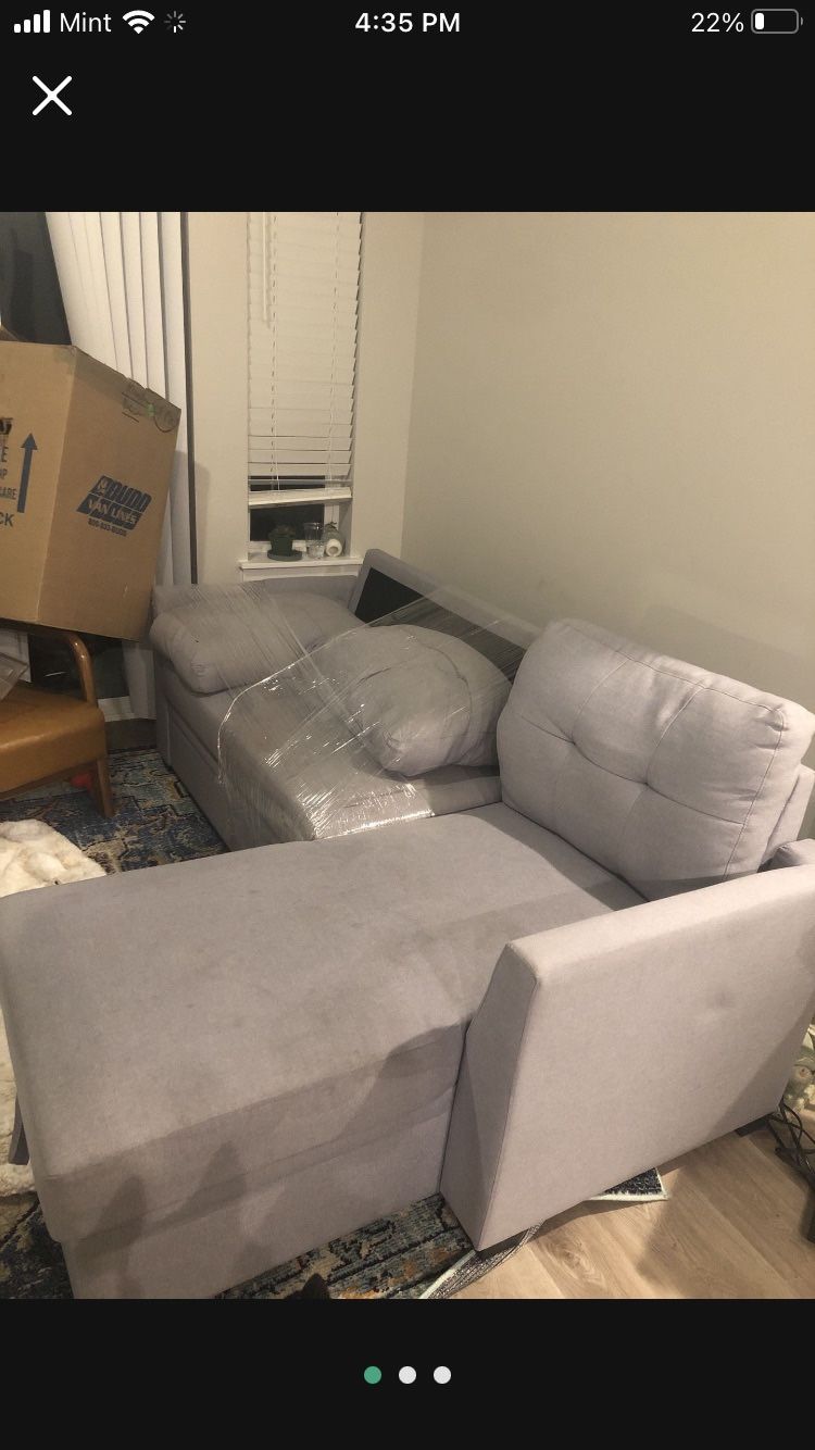 Pulls out to a full size bed. Arms are detachable. Chase is detachable which also opens up for big storage space. You can make it a small love seat or a sectional. You can have the chase in another room or piece it all together. Awesome little thing.