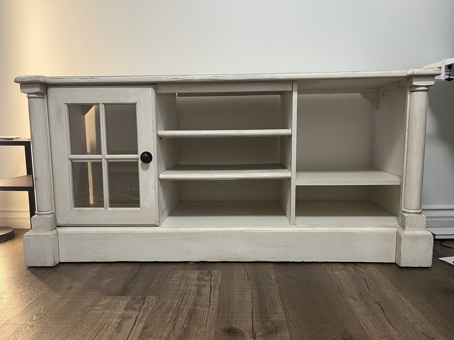 farmhouse-style TV console with glass cabinet door and open shelving for storage or media components. Solid, sturdy piece. The top has a naturally distressed finish that gives it a rustic look (see photos) with some wear. Would also be a great candidate for a light sand + repaint if you want a fresh finish. Perfect for living room, media room, or even as a buffet/entry console.