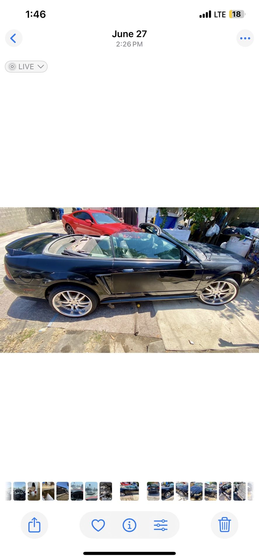 FOR PARTS!! Black Ford Mustang GT Convertible 2000yr V8 96k miles Original catalytic converter 4.6L engine (Good) Transmission 5- speed automatic (Good) Original Stereo Rims size 20's Convertible TOP NOT IN GOOD CONDITION!! Everything you see in the picture is still available. The engine and transmission still good! Has 96k miles. Se habla español también. Good for mustang v6 v8 2000 2001 2002 2003 2004. Fourth generation SN95.