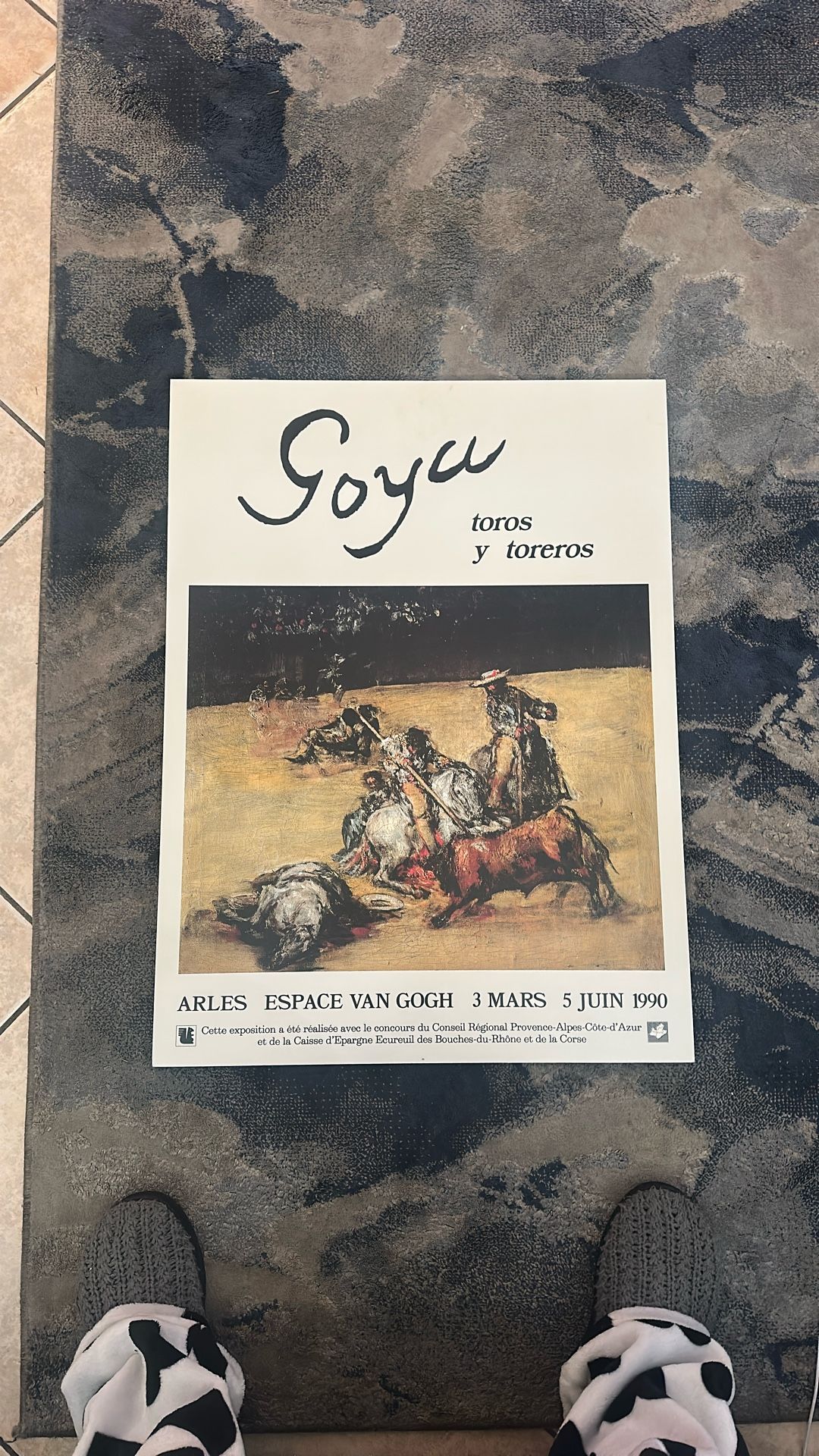 Canvas poster for a 1990 art exhibition in Arles, France, featuring works by the Spanish artist Francisco Goya. The exhibition focused on Goya's depictions of bullfighting