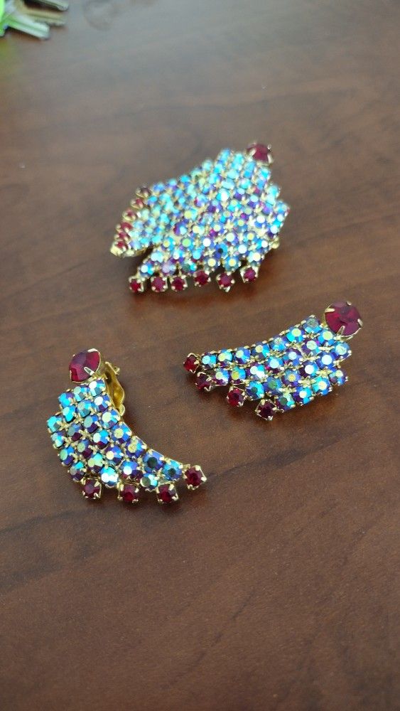 Available for purchase is a set of rhinestone brooch in a ruby red with AB finish with matching clip-ons Brooch: 2 1/2 x 2 Earrings: 3/4 x 1 3/4