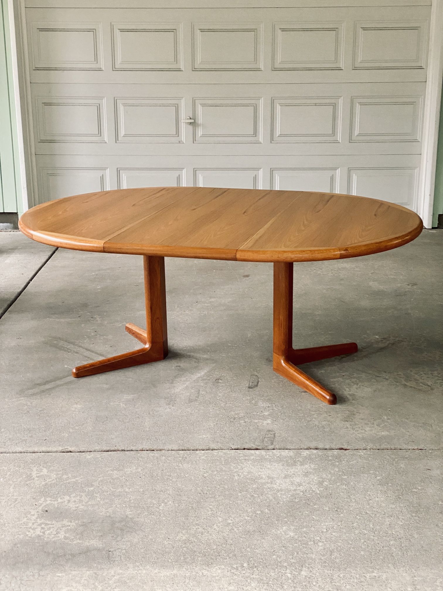Dimensions: 49Lx49Dx28H Each leaf: 21 inches long Danish, teak round to oval dining table by Laurits M Larsens in good condition. With both leaves in use, it becomes 91 inches long and can serve 8 people comfortably. Leaves don’t store inside the table. Photographed here with a set of teak chairs that are available separately (check our page for chairs’ post). Cash, Venmo or PayPal accepted No holds without a deposit
