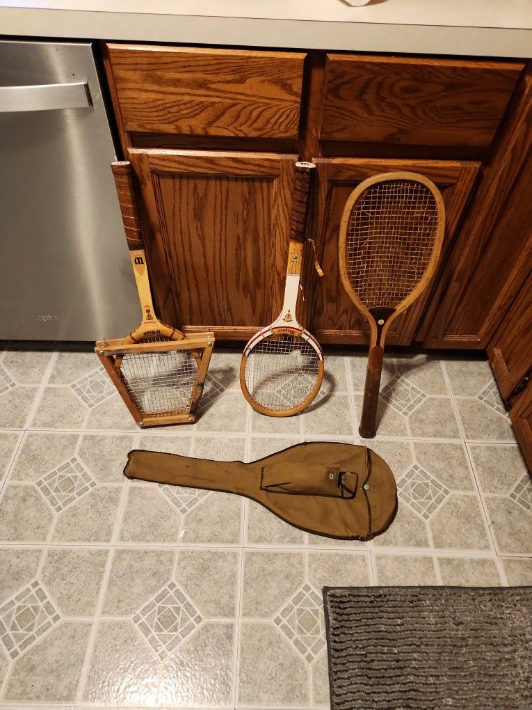 These are old wooden rackets. One says 1905 on it and has the bag it's the one on the far right and the bag is in front. The other is a wooden Wilson brand and the third is a Magnan. Which was established in 1904. Pictures show quality
