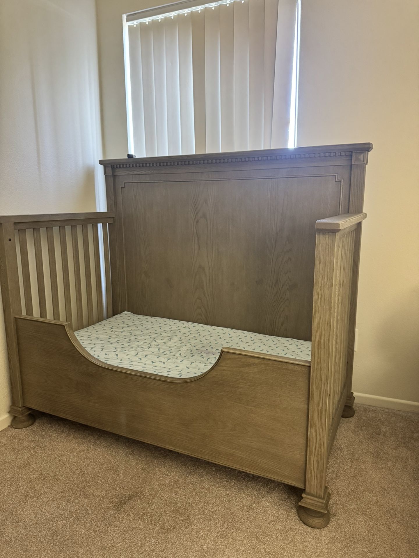 Restoration hardware crib with railing for traditional crib and extension for toddler bed (as pictured). Also have a newton mattress that fits the crib which you can purchase for an additional cost. (250 for mattress and crib). Or 200 for just crib. Both are in almost new condition.