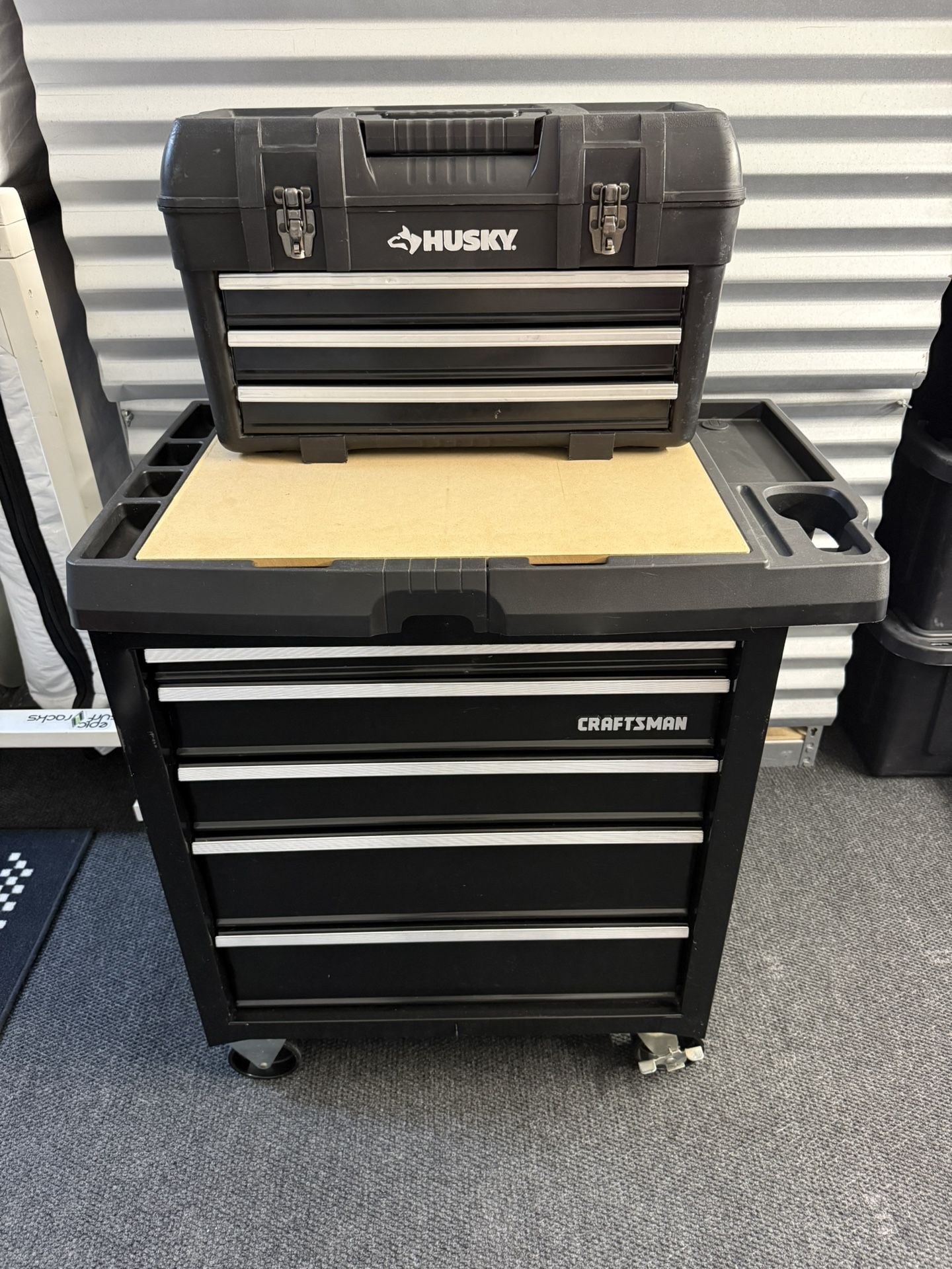 CRAFTSMAN Rolling Tool Cabinet & HUSKY Tool Box Combo. Excellent Condition. Brand Name:Craftsman Sub Brand: S1000 Product Type: Rolling Tool Cabinet Brand Name: CRAFTSMAN Color: BLACK Depth: 18 inch Height: 32.5 inch Lockable: Yes Material: Steel Number of Drawers: 5 drawer Sub Brand: S1000 Weight Capacity: 650 pound capacity Wheeled: Yes Width: 27 inch Ball Bearing Slides: Yes Built-In Power Strip: Yes Storage Volume: 8030 cubic inch Work Surface: Yes
