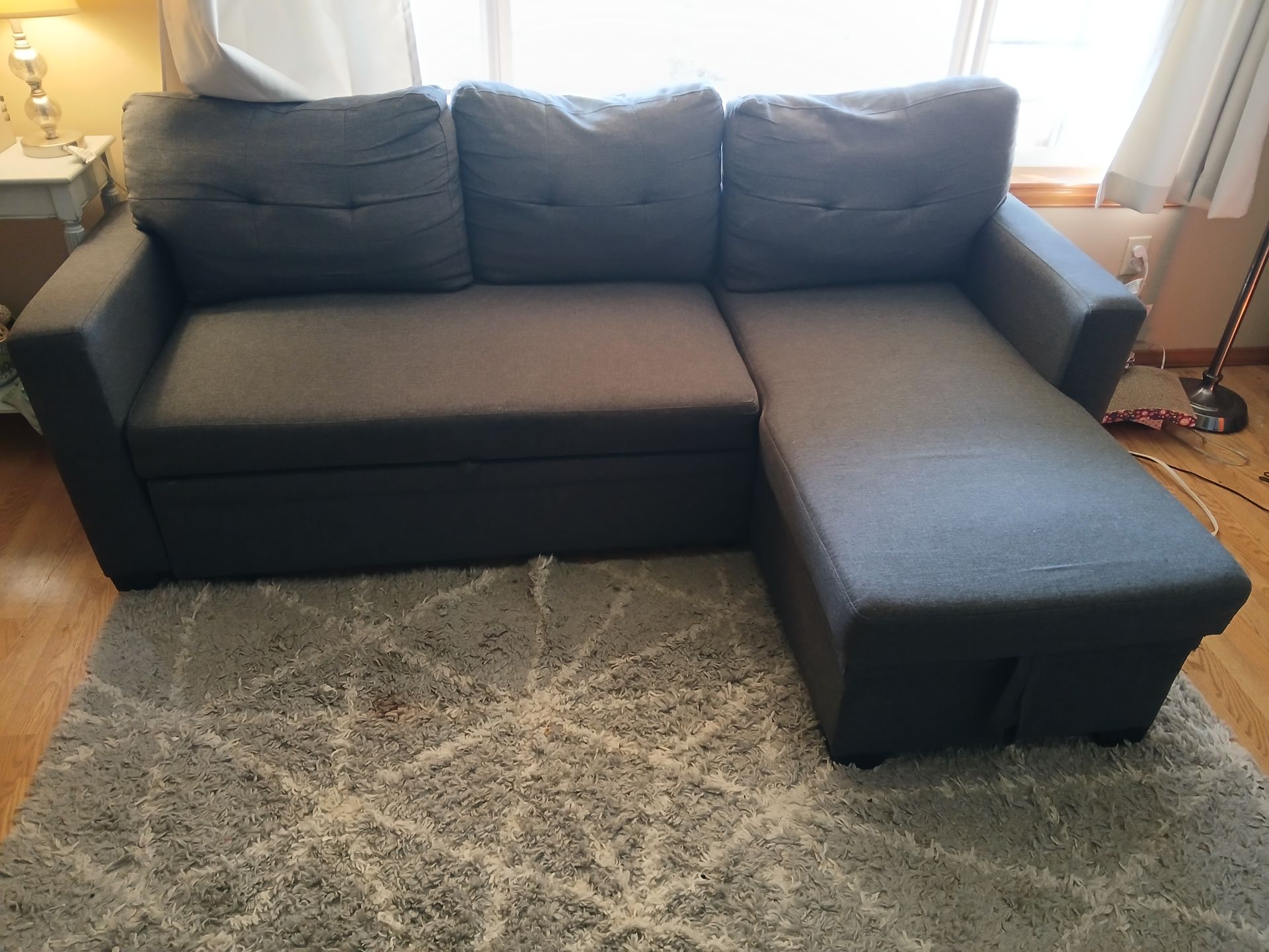 Small L shaped couch with pullout bed. Comes apart into 8 pieces for easy transport. Small tear in the pullout as seen in last pic. 30$ obo