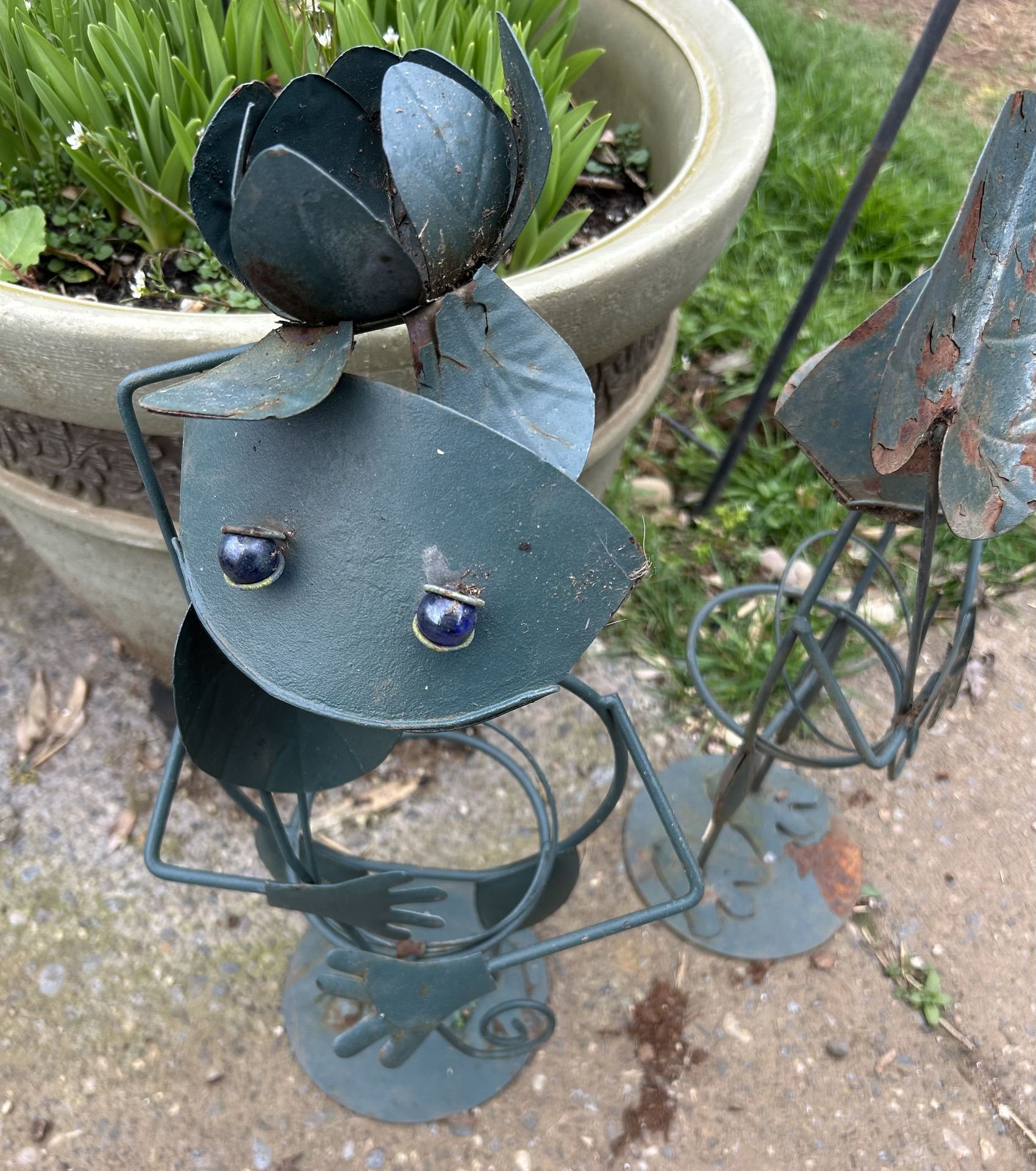 Rustic old pair of metal frog garden statues. Green color with blue marble eyes. One frog has a cool lotus flower head the other hold a leaf for umbrella . Good for adding character to garden or patio. Needs a spray paint! 1’ft8”height 5”wide bottom stand Pick up In Brush Prarie Cash FCFS If it’s up it’s available I won’t respond if asked