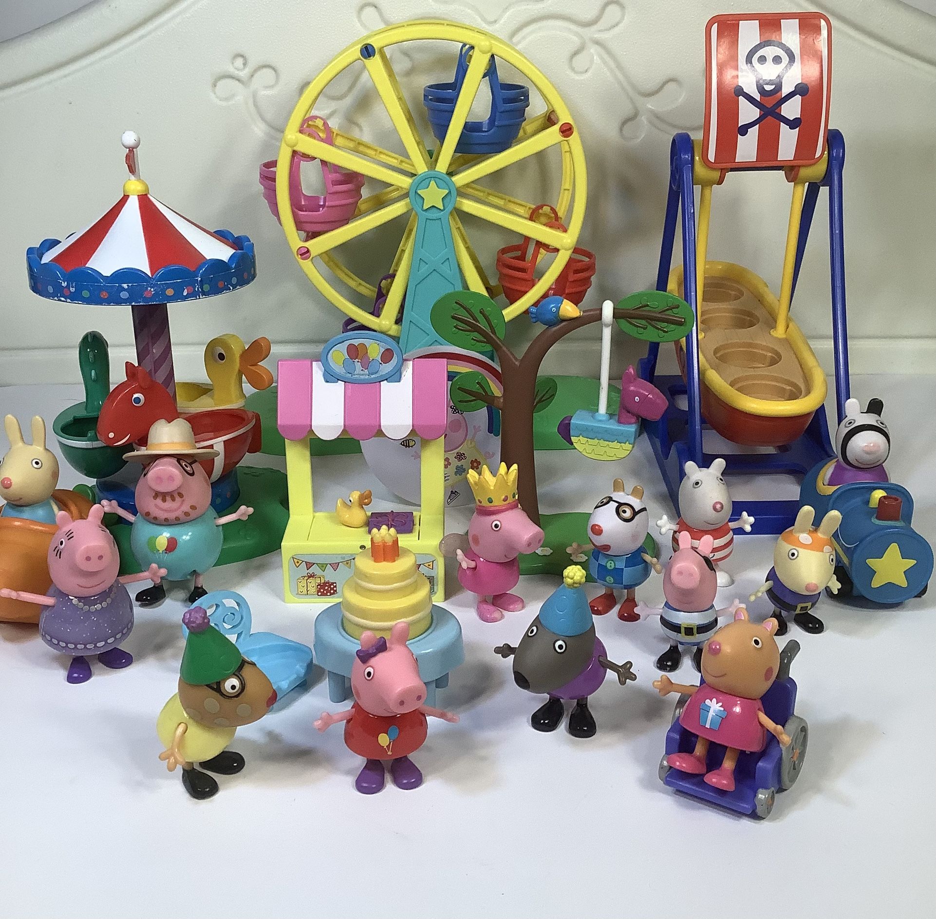 Assorted Peppa Pig set includes a ferris wheel, carousel, Pirate see saw, mini vehicles and figures. All are in good condition