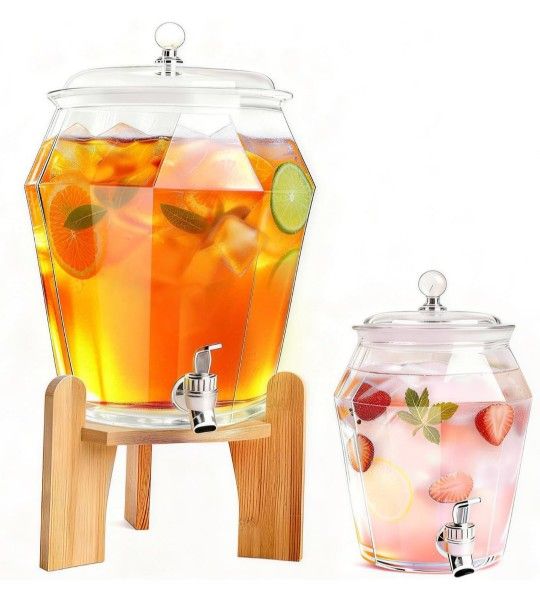 2 PCS Drink Dispenser Set, 2.5 Gallon Total Capacity (7L & 2.6L) - Shatterproof Plastic Beverage Containers with Wood Stand, Leak-Proof Spigot for Jui